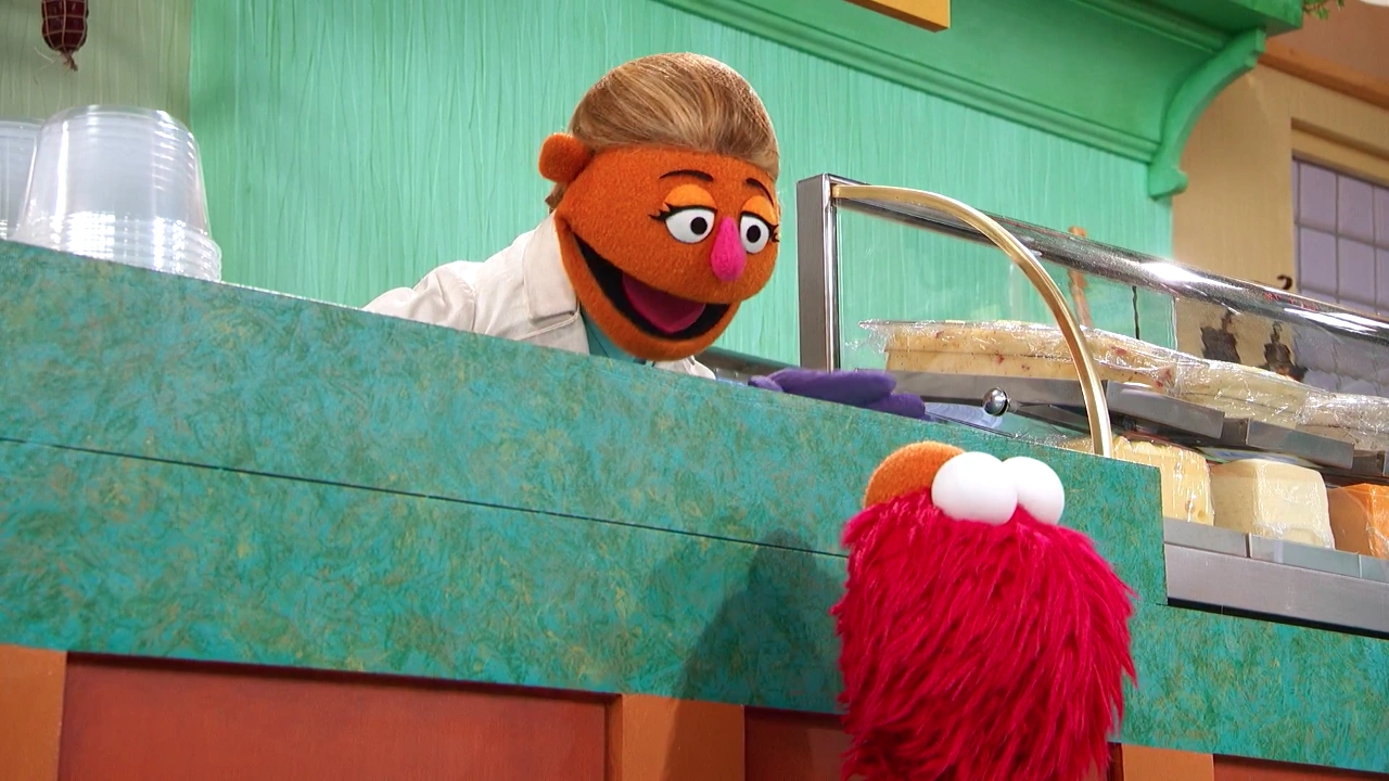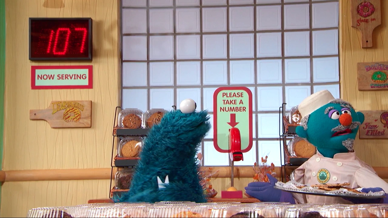 SCENE 1 cont'd | Cookie Monster finds himself in the bakery, wishing to live there when he sees all the delights. The bakery clerk tells him to take a number and wait to be called. Elsewhere, Alan finishes collecting everything he needs, but assures Elmo and Abby they have until he's done checking out before they lose. Cookie Monster impatiently waits for his number to be called and is finally able to snag one of the freshly-baked cookies. He restrains himself from eating it to rejoin his friends, just in time for them to win! He makes sure Alan's groceries are paid for before eating his treat. |