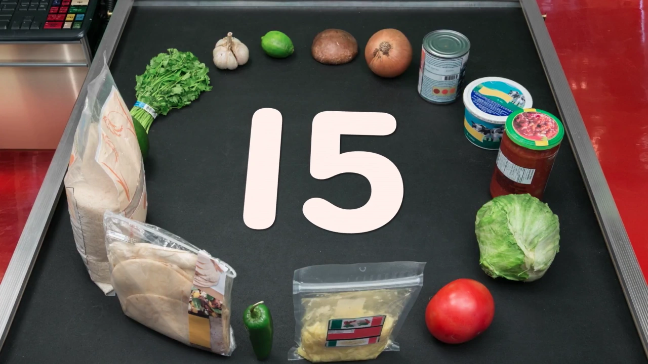 Animation | Fifteen items are counted at the supermarket, which are then used to make a burrito meal. |