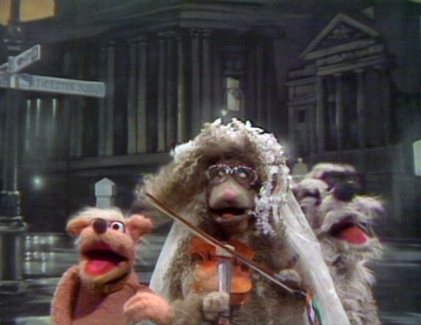 | Two dogs sing "Fit as a Fiddle" to a fiddle-playing French Poodle. | |