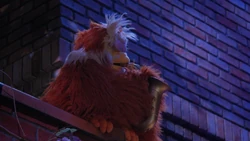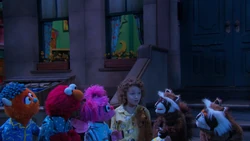 SCENE 1 cont'd | The young ones hear the sounds of a saxophone and look up to see Hoots the Owl playing some jazz. He explains that since he is nocturnal, the nighttime is when he's awake and ready to jam. As they talk to Hoots, they hear a swift sound and notice their marshmallows are now gone. Rudy theorizes the Tooth Fairy must have mistaken them for teeth, while Abby whips out her magnifying glass to find some clues. They recall hearing the sound from before and see paw prints left at the crime scene. They follow the tracks to the stoop of 123 Sesame Street, where a pair of raccoons (Tyler Bunch and Pam Arciero) are digging into the marshmallows. They apologize for stealing and earn themselves an invite to the marshmallow roast. |