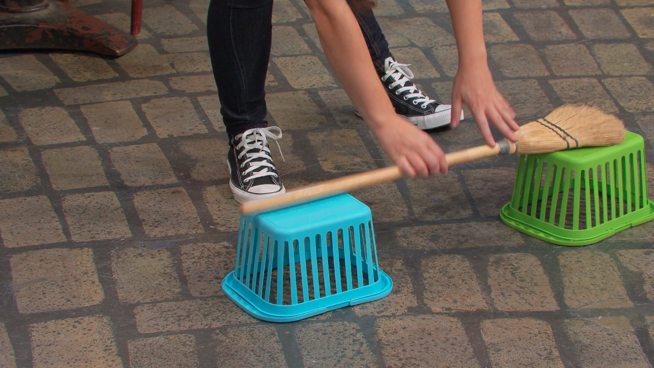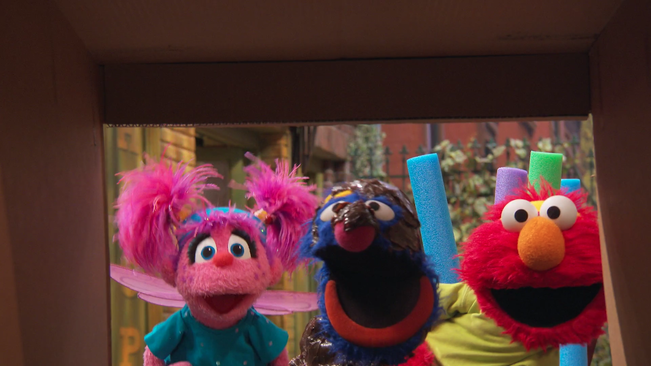 SCENE 1 cont'd | Nina tells them that they'll need things they can go over, under, around, and through with. Grover is discouraged that they don't have anything suitable, but is constantly reminded of their problem-solving motto. They first employ a broom and some laundry baskets to go over, then a blanket and chairs to go under, then pool noodles (attached to plungers) to go around, and finally a cardboard box to go through. To help the youngsters remember what to do during the race, Nina sings a short tune about the directions. |