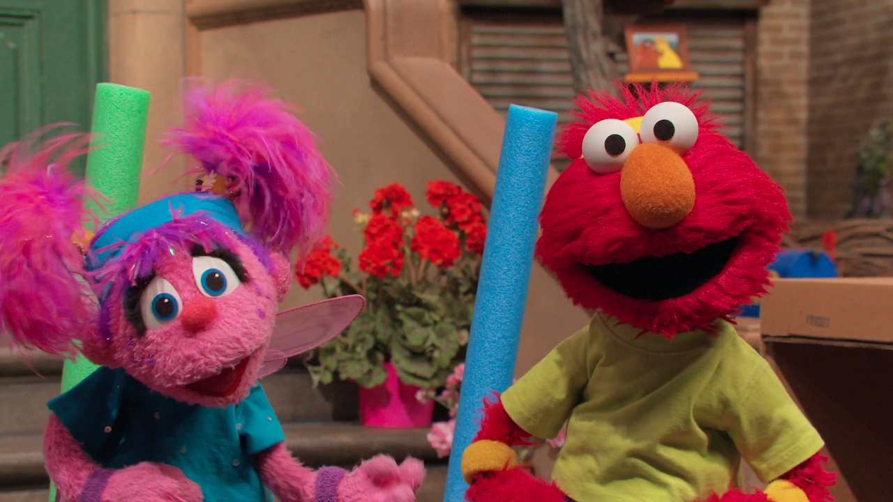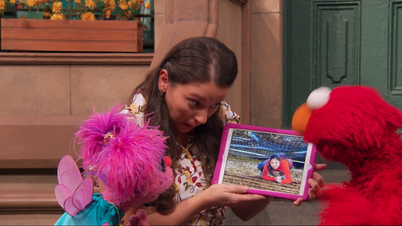 SCENE 1 | Nina shows Elmo and Abby pictures from a "Tough Mud Race" she participated in. Her pictures illustrate how the obstacle course had her go over, under, around, and through various things. Abby believes they should make their own obstacle course on Sesame Street, which Nina dubs a "Tough Monster Race." Grover rushes in, claiming to be an expert on "popsicle races." Nina tells them that to make their race, they'll need some supplies. |