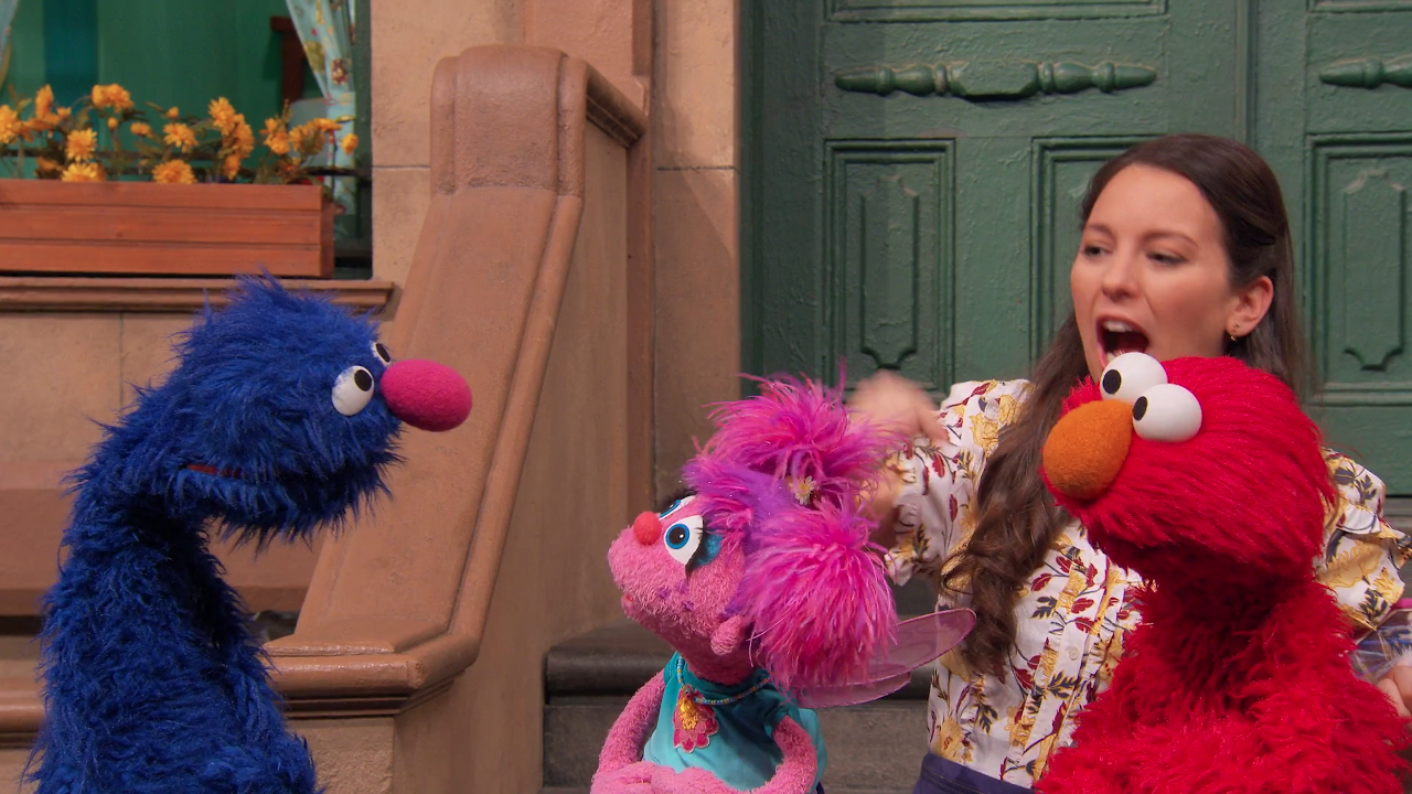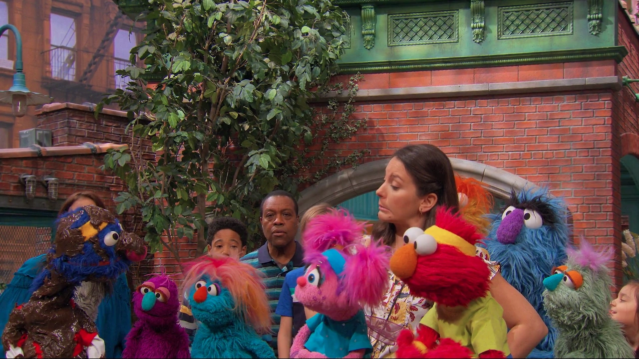 SCENE 1 cont'd | The obstacle course has been set up across Sesame Street, as a small crowd of people and monsters (including Herry Monster) gather to watch. Grover shows up covered in mud, believing it was a requirement. Guy Smiley appears to commentate as the race begins. Using Nina's song as a reminder, Elmo, Abby, and Grover go through the course using the various directions. After they reach the finish line, Grover celebrates with a muddy group hug. |
