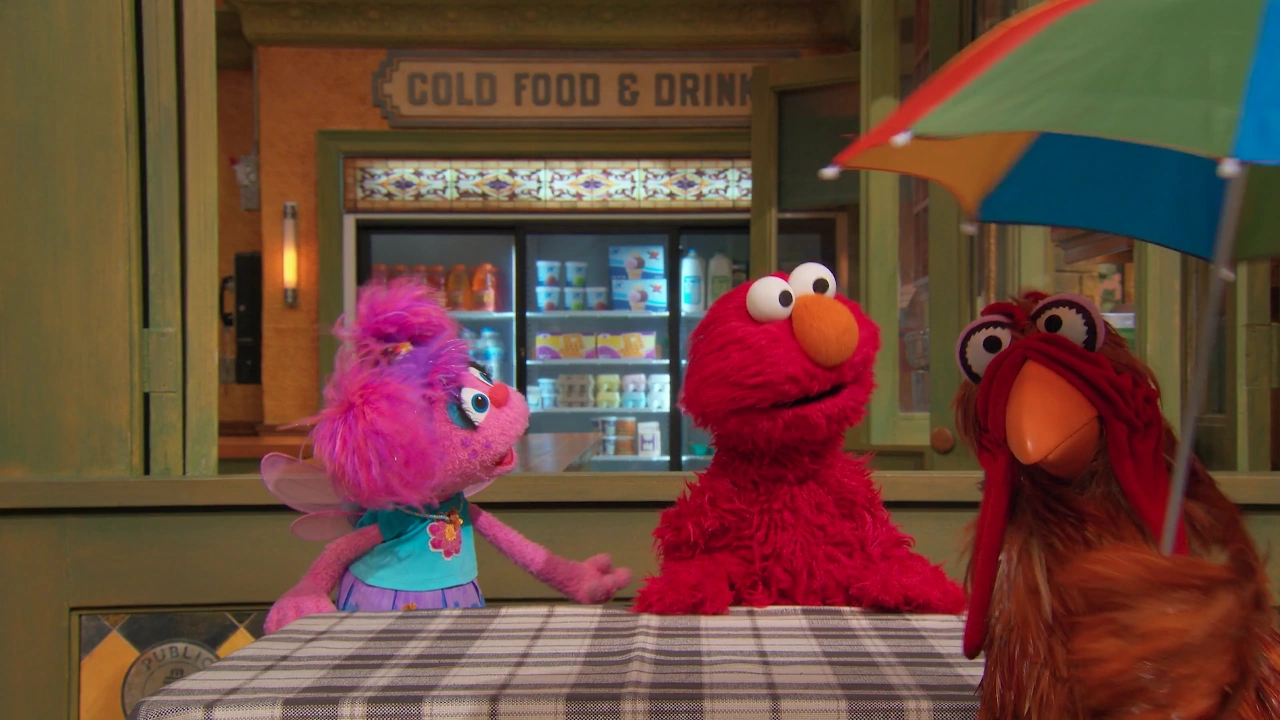 SCENE 2 | Elmo and Abby play the opposite game by looking for things that are opposites. They see a chicken go by who is under an umbrella, which is over the chicken. |