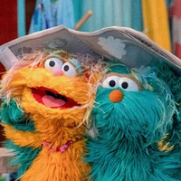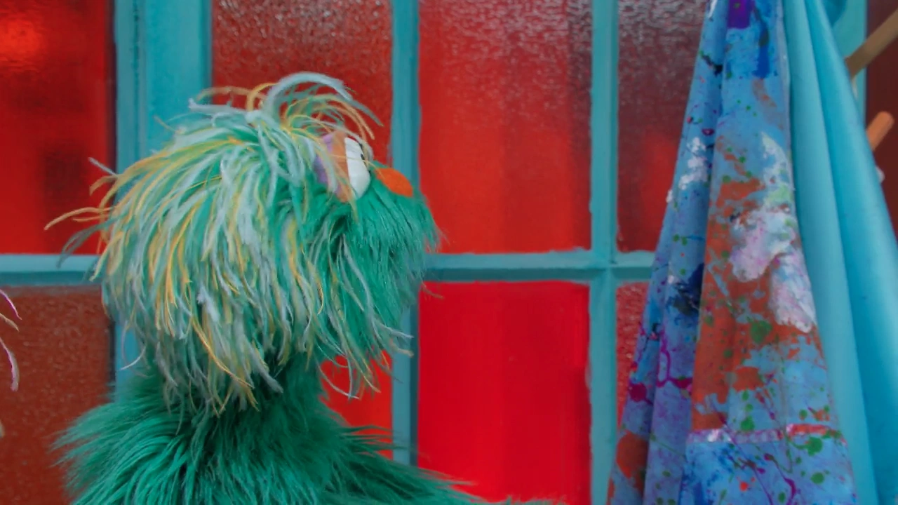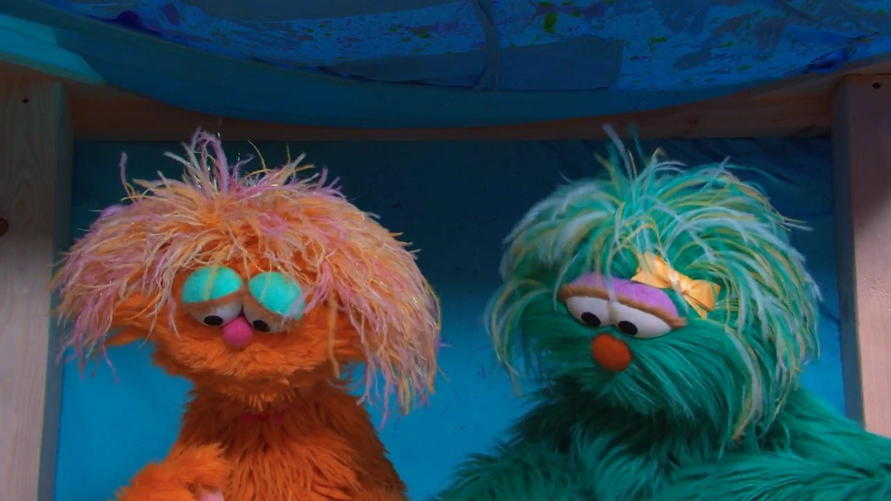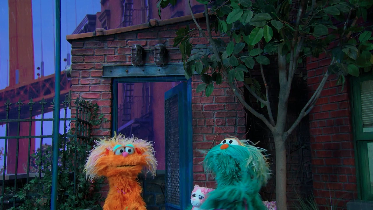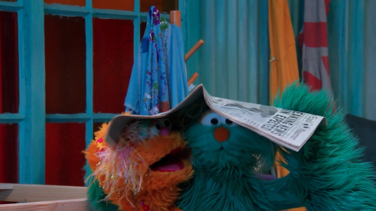 SCENE 1 cont'd | Zoe is ready to give up, but Rosita starts to sing a song about how scientists keep trying until they come to a solution. Zoe notices some of the painting smocks hung up and thinks they might keep them dry outside. Rosita suggests using Big Bird's smock, which is big enough to cover them both. They take it outside and test it on Gatito, who remains dry under the rain. The monsters celebrate and go under their invention to start drawing. |