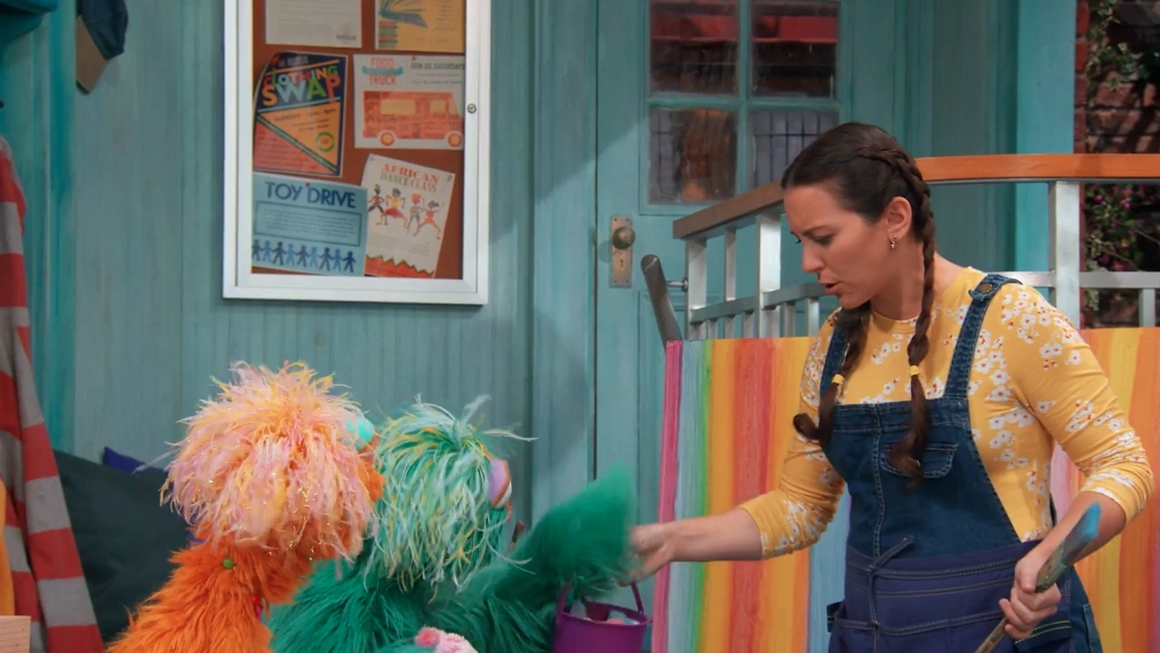 SCENE 1 | At the community center, Nina paints a table top, when Zoe and Rosita come by to get some sidewalk chalk. Nina points out the impending rainfall, but the monsters aren't worried...until they step outside and immediately get caught in it. They retreat indoors, when Nina has to dart off to help Alan with a leak. |