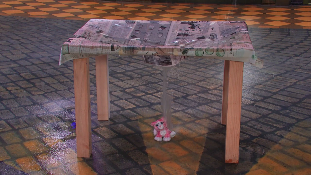 SCENE 1 cont'd | Zoe believes there must be a way they can still draw outside without getting wet or letting the rain wash away their drawings. There's no umbrella in sight and they can't hold a newspaper together and draw at the same time. They then see the topless table Nina was working on and believe this can help them. They cover it with newspaper and push it outside, then use Rosita's lovey Gatito as a test. The newspaper holds up for a moment, before completely giving way to the rain and soaking Gatito. |