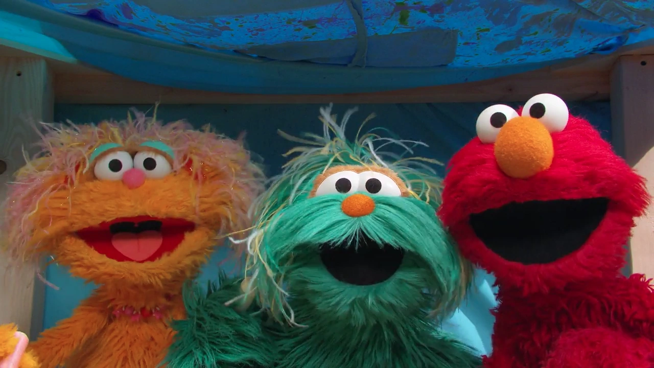 SCENE 3 | Elmo has joined Zoe and Rosita in their rainproof drawing space. The rain soon stops and the sun comes out, but the monsters agree it's more fun to stay where it's shady and cool. |