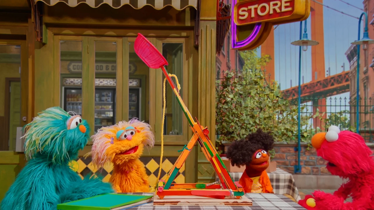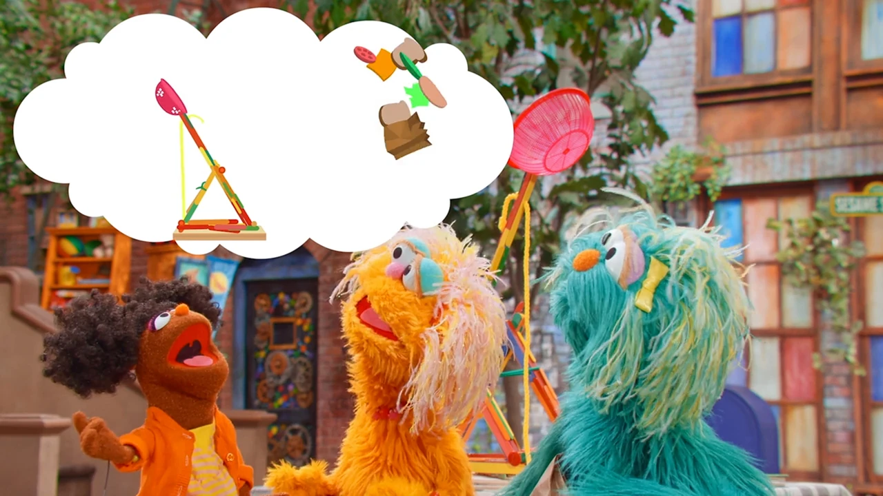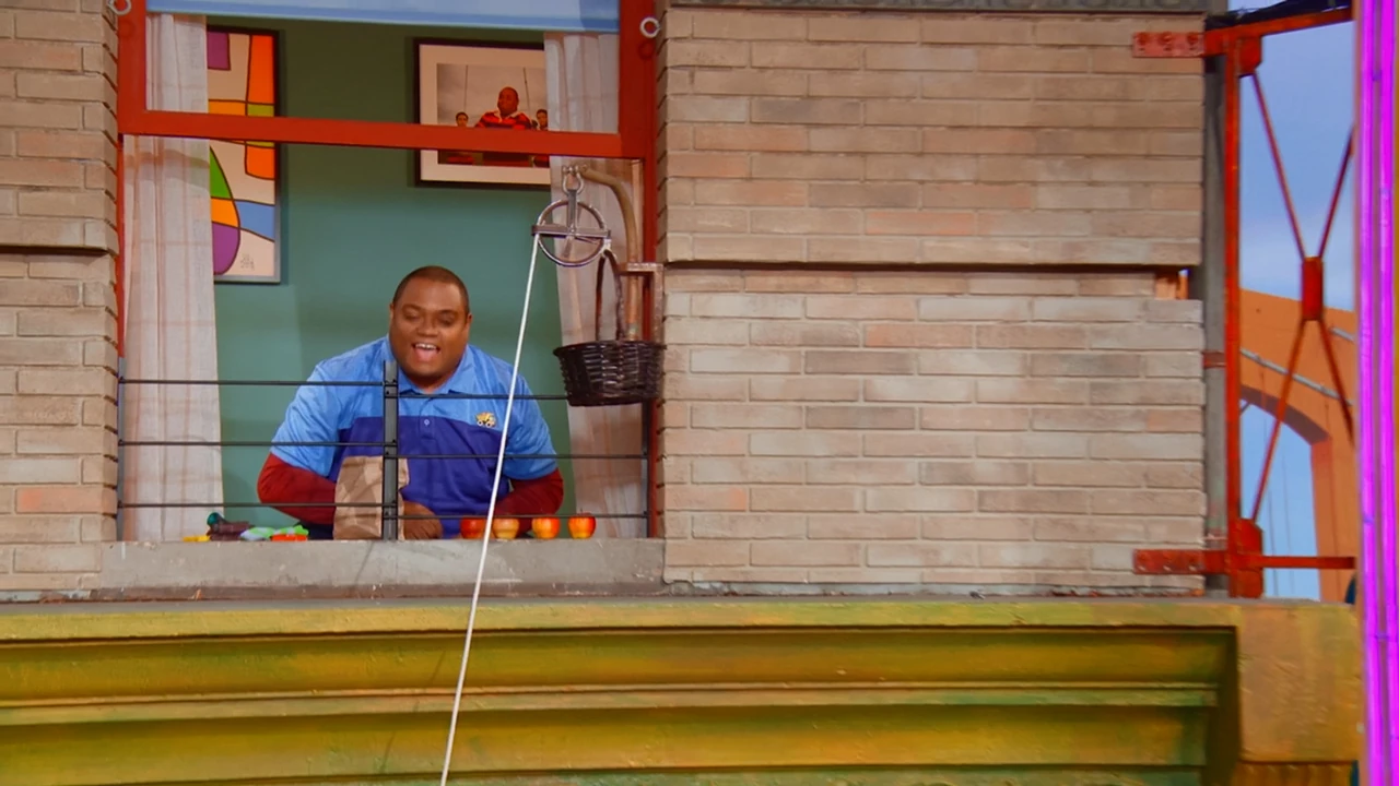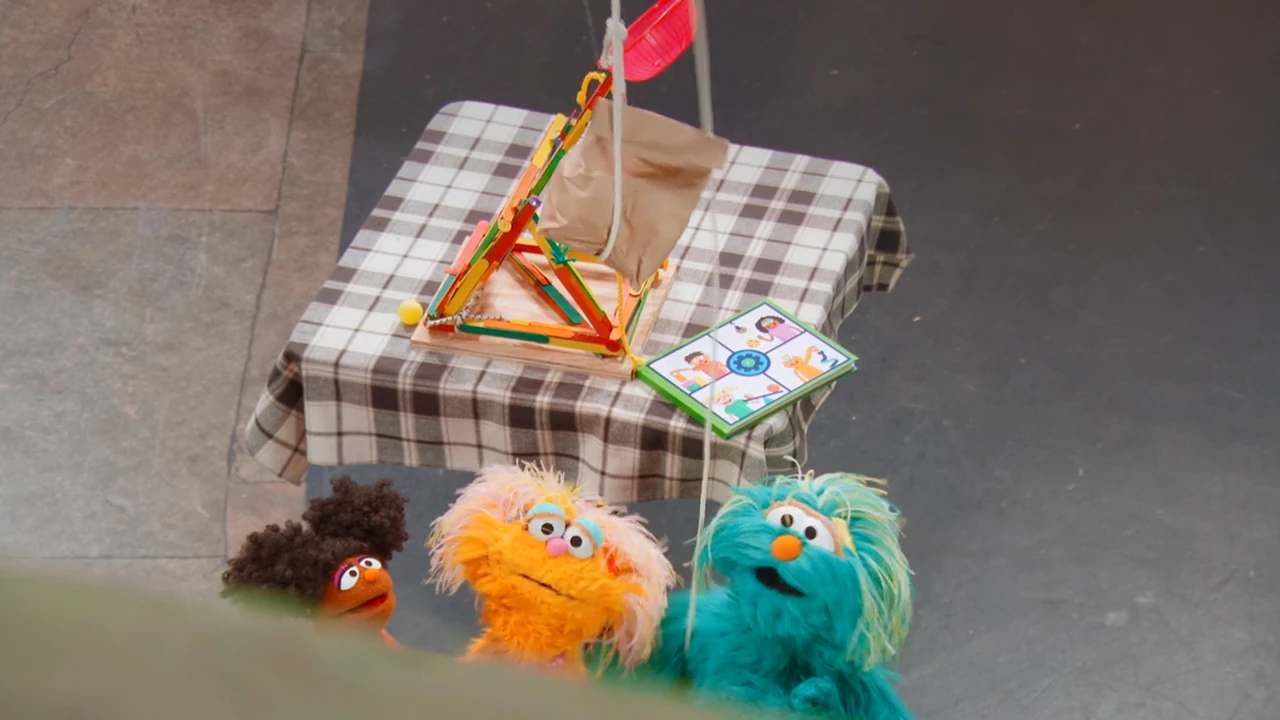 SCENE 1 | As Elmo welcomes the viewer, a ping pong ball drops to the ground. Elmo finds that Gabrielle, Zoe, and Rosita were testing a catapult that they learned to build from the book Everyone Can Be an Engineer. They show Elmo how their catapult works, this time launching the ball into Alan's apple basket. Louie then calls Elmo in for lunch. As Elmo leaves, Chris greets the others from his apartment window above Hooper's Store. Chris is resting his ankle, having fallen and sprained it. Alan volunteers to make him lunch and suggests that the girls can deliver it to his apartment. |