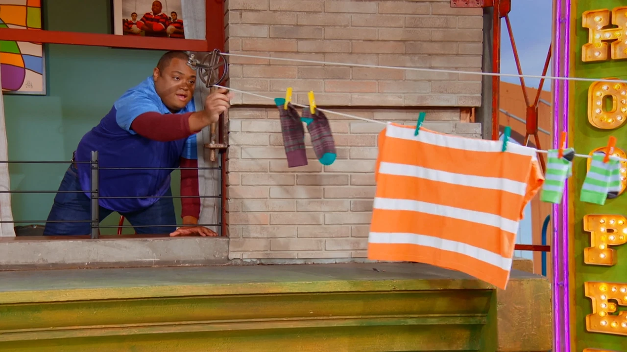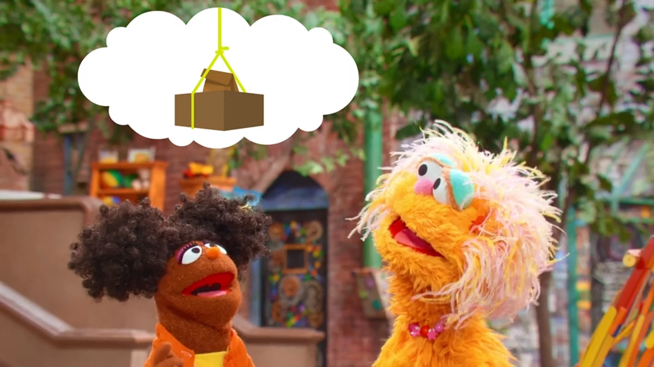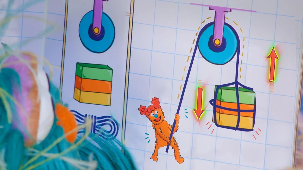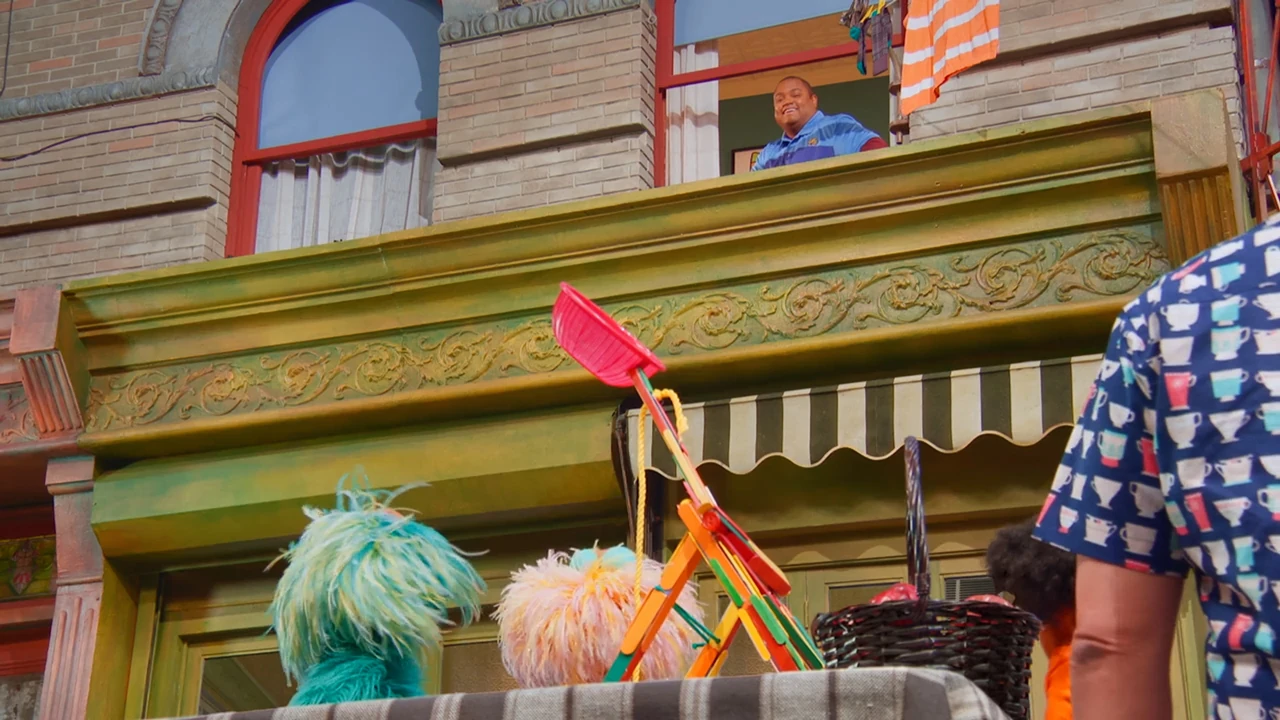 SCENE 1 | As Elmo welcomes the viewer, a ping pong ball drops to the ground. Elmo finds that Gabrielle, Zoe, and Rosita were testing a catapult that they learned to build from the book Everyone Can Be an Engineer. They show Elmo how their catapult works, this time launching the ball into Alan's apple basket. Louie then calls Elmo in for lunch. As Elmo leaves, Chris greets the others from his apartment window above Hooper's Store. Chris is resting his ankle, having fallen and sprained it. Alan volunteers to make him lunch and suggests that the girls can deliver it to his apartment. |