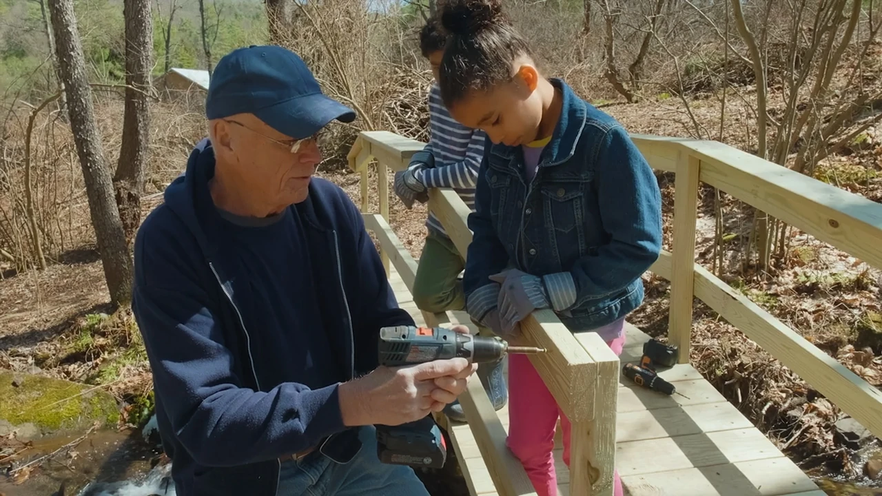 Film | E Is for Engineer: Two kids help their grandpa build a wooden bridge so they can cross a stream without getting wet. |