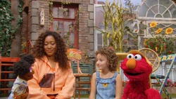 Celebrity | Athlete Naomi Osaka is about to teach Elmo, Charlie, and Gabrielle how to play tennis, but they need to put on sunscreen first. Gabrielle asks if she needs to wear sunscreen despite having a different color skin. Osaka explains that all skin has melanin in it, and that people with darker skin have more than those with lighter skin. Super Sunscreen arrives and explains that, while melanin does protect the skin, you still need sunscreen to be a "melanin helper." Another type of "melanin helper" is visors, which Osaka provides for everyone. Now that they are protected against the sun, they are ready to play. |
