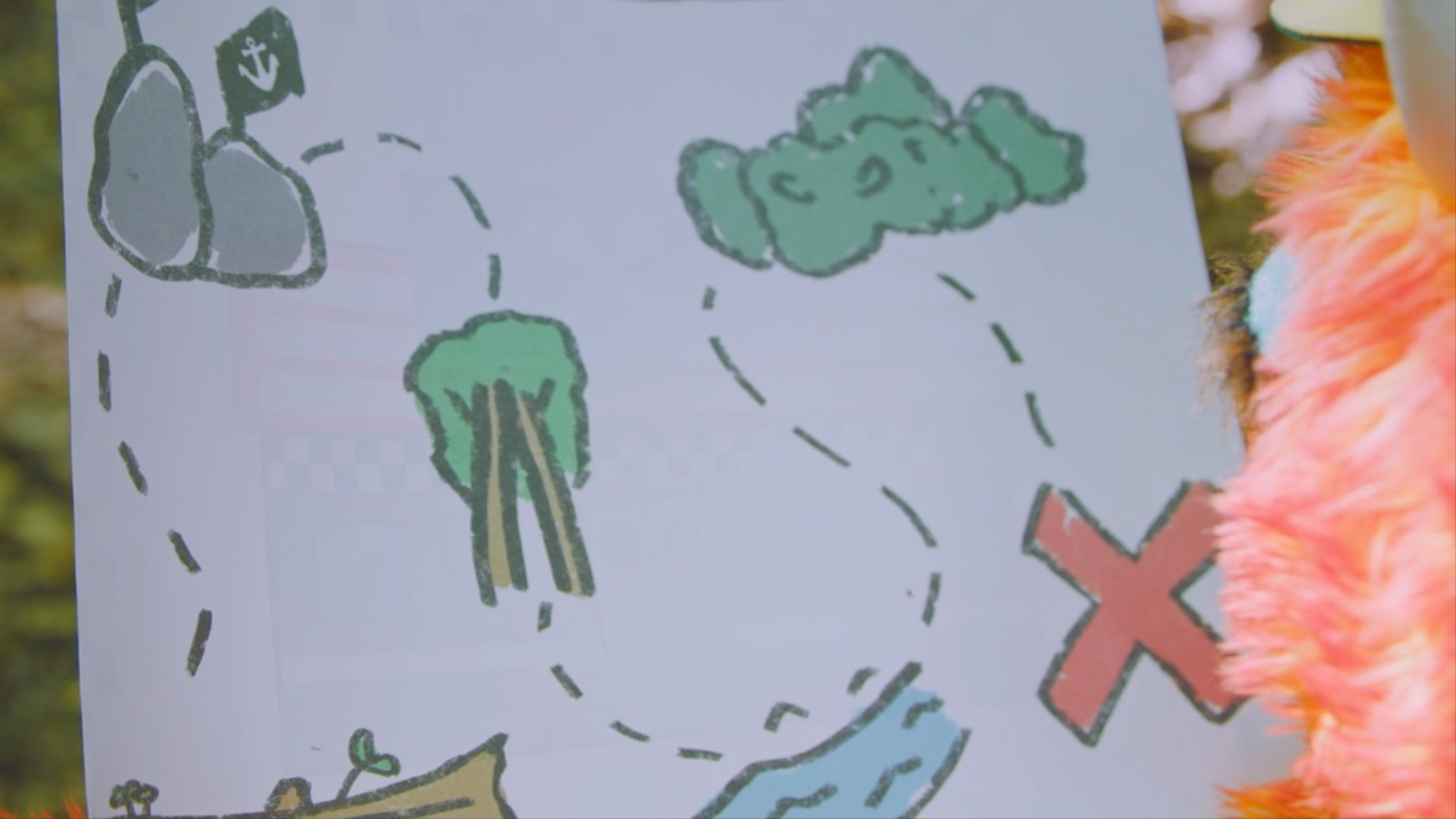 SCENE 1 cont’d | After talking about potentially going home, Freddy pulls out a piece of paper. On it is a treasure map. After hearing about the potential treasure they could find, Rudy is now convinced to keep hiking in order to find the treasure. They follow the map to lead them to treasure, first stopping at a few rocks. Before heading off on the trail, Rudy eats a very small pinch of trail mix, and is suddenly boosted with energy. The next stop is a couple of trees, where they drink water to keep themselves hydrated, another way of staying healthy. Abby notices a pretty rock and asks if it’s treasure. Freddy responds that anything you call treasure, is treasure. This leads to a large rock collection of Abby and Rudy’s. Freddy suggests only choosing one piece of treasure, that way there’s not as many and other people can find it. |