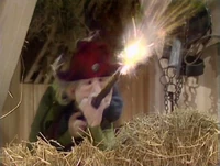 Huh? My horse? (runs outside) Hey — hey, you kids get away from that horse! That's a brand-new horse!