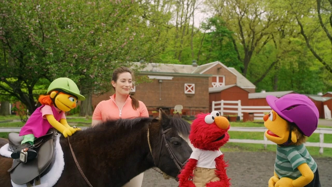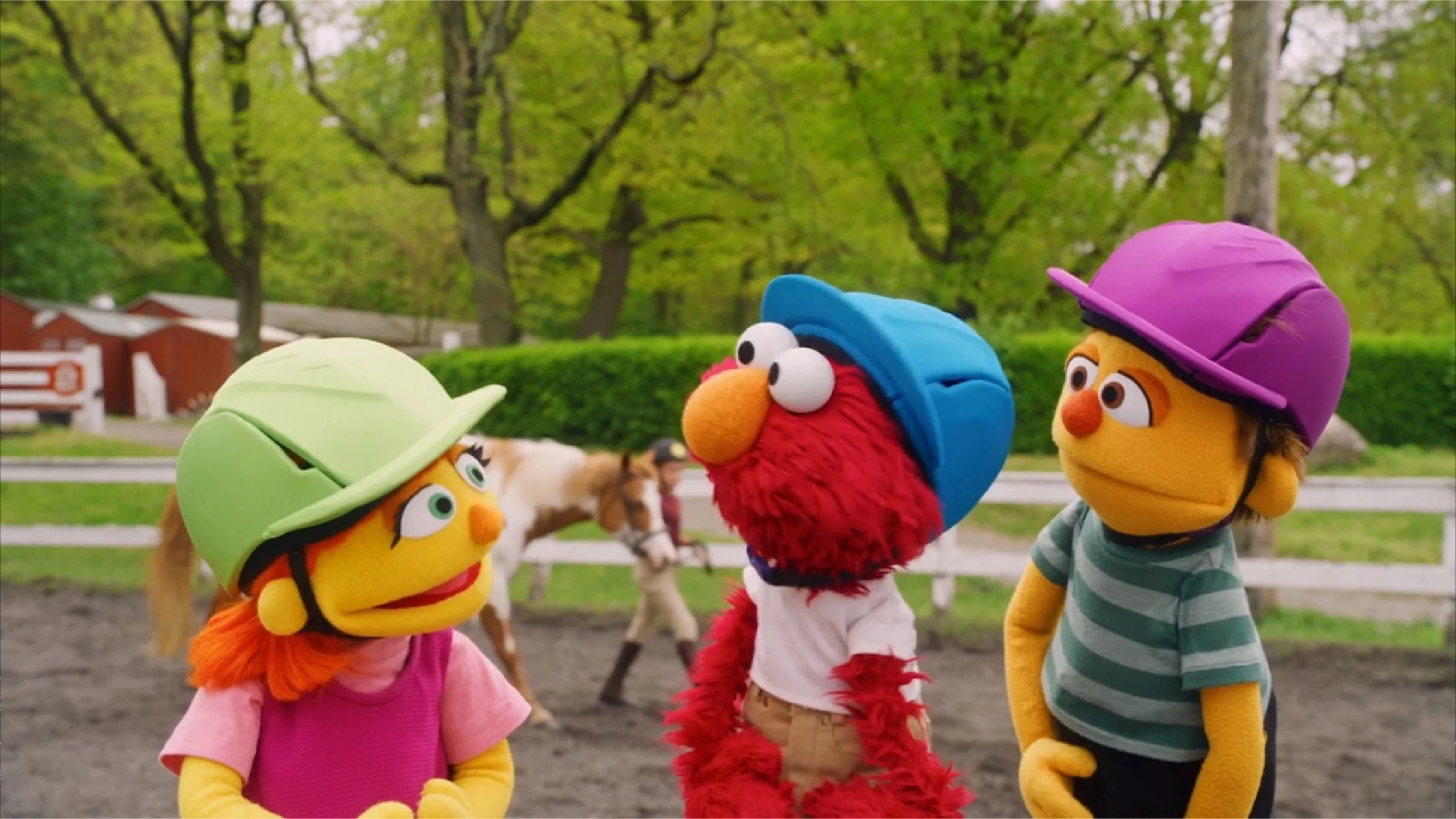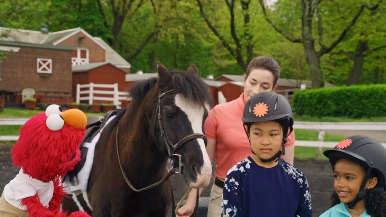 SCENE 1 cont'd | It's finally time for Elmo to ride Tony, and Elmo stalls, unsure if he can do it. Sam and Julia reassure Elmo, saying they were both nervous at first too. Sam then has the idea of belly breathing to calm Elmo down and get ready to ride Tony. Elmo tries it, and feels a lot better, and he rides around the farm on Tony. |