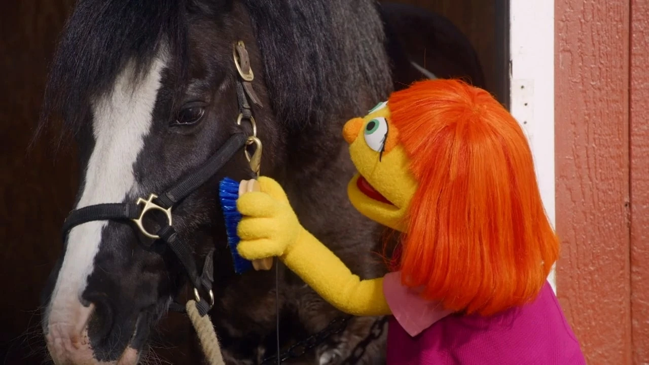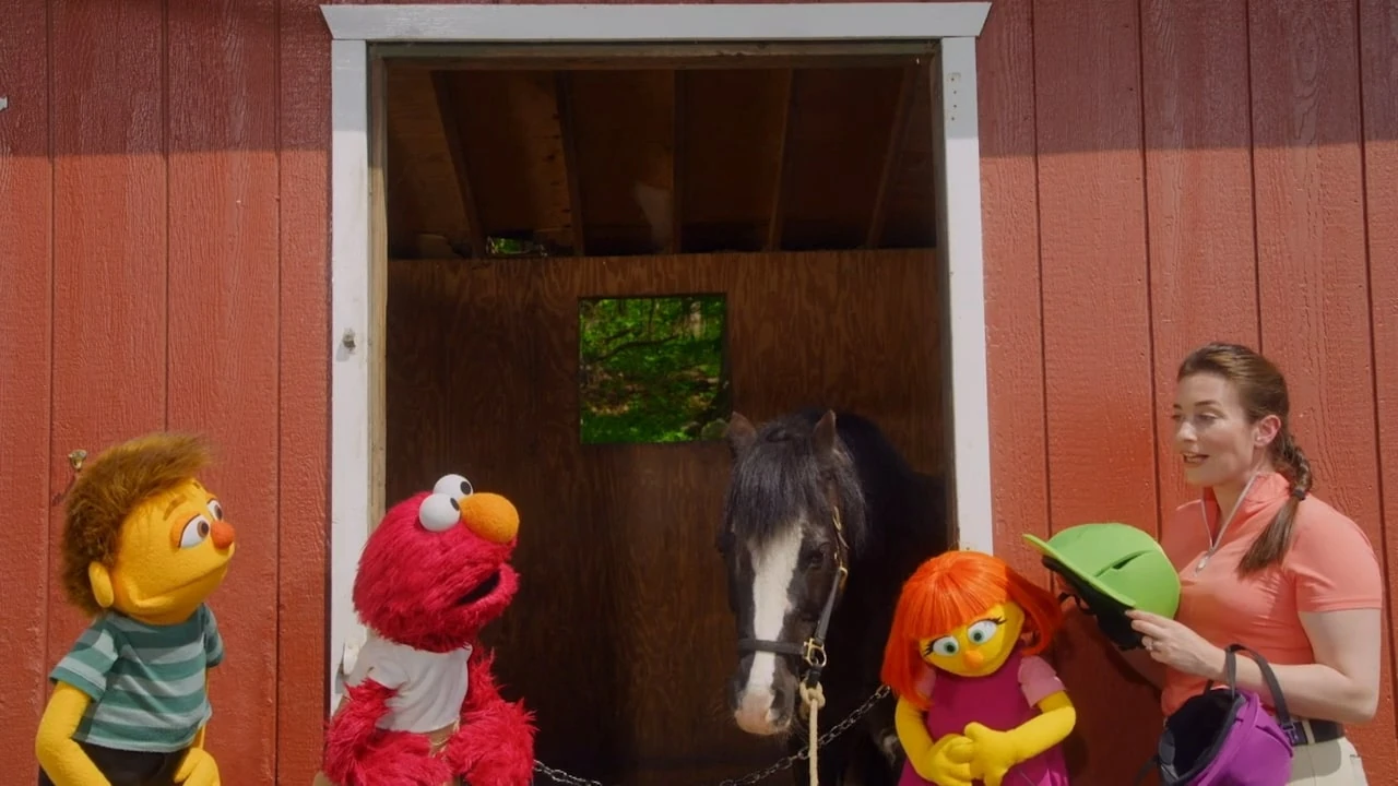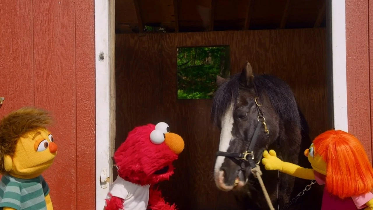 SCENE 1 cont'd | Elmo gets ready to ride Tony, and Julia asks Elmo to say hi to Tony. Sam backs her up, saying you wouldn't go up to someone you've never met and give them a hug, and that you need to be comfortable with the horse before you ride it. Julia teaches Elmo how to say hello, by showing that he needs to look to Tony's side because that's where his eyes are, and that he needs to touch Tony's nose with his hands. Tony makes it clear that he likes Julia, and Sam says that Julia's great with ponies, and being with ponies helps Julia practice talking and touching gently. |