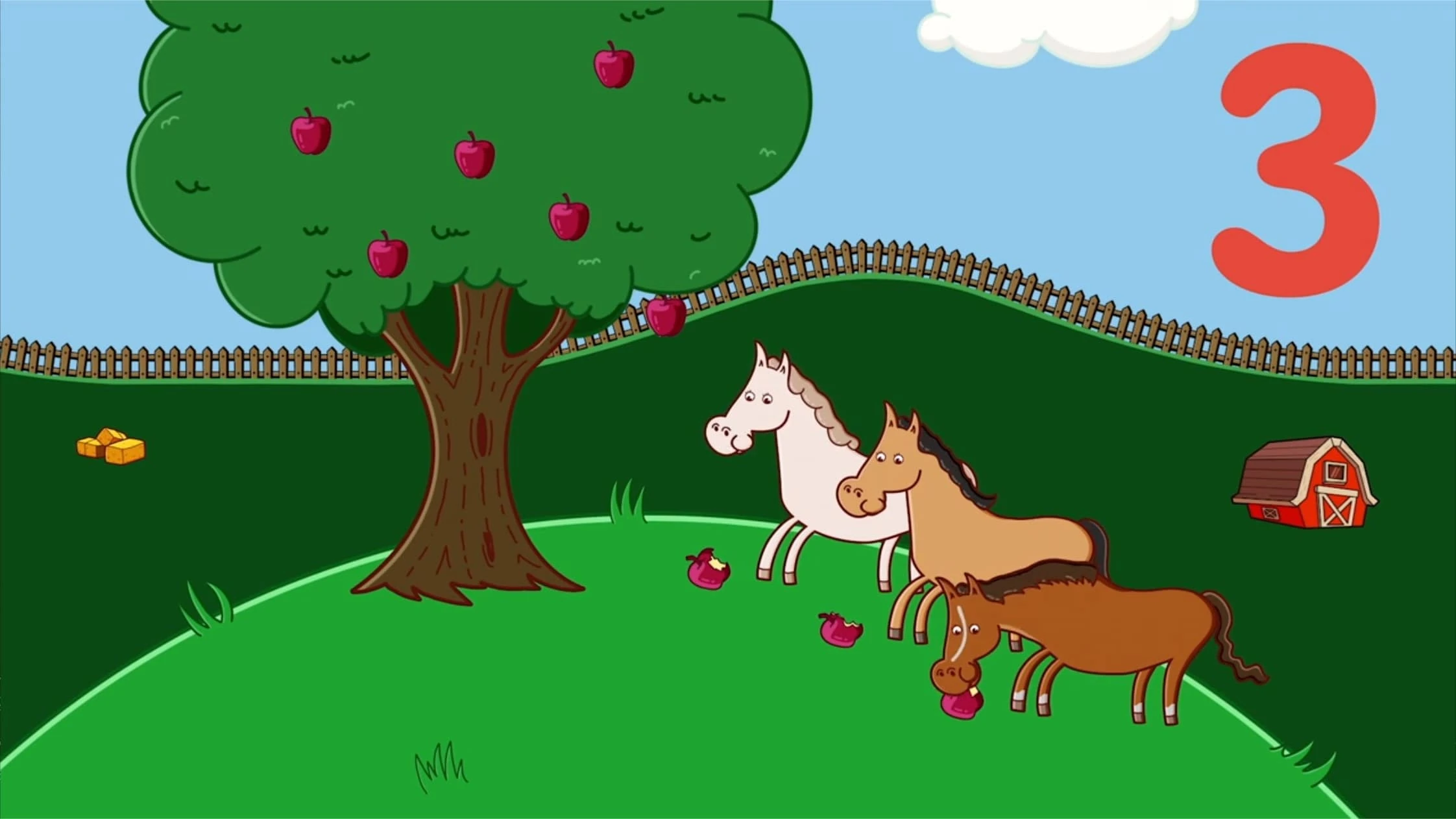 Cartoon | A girl tells a poem of three playful horses who leap over haystacks, eat apples, and run through a meadow. |
