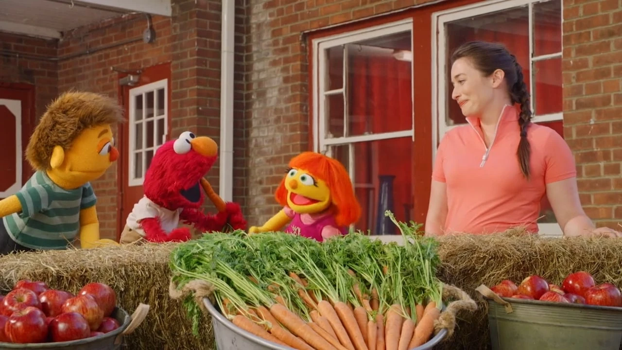SCENE 1 cont'd | Elmo thinks it's time to ride, but Julia says it's first time for food. Julia hands Elmo a carrot, and Elmo starts to eat it thinking it's for him, but Julia tells him it's the pony's food. Sam says carrots are Tony's favorite, and Elmo asks how the two know so much about Tony. Sam explains that they help take care of him every time they're at the horse farm. Julia feeds Tony a carrot, and Elmo follows with another carrot. Julia then gets out a brush, and demonstrates to Elmo how to brush Tony. Sam says that brushing is good practice for doing other things with your hands, and brushing Tony makes him feel good. |