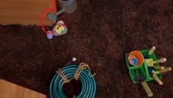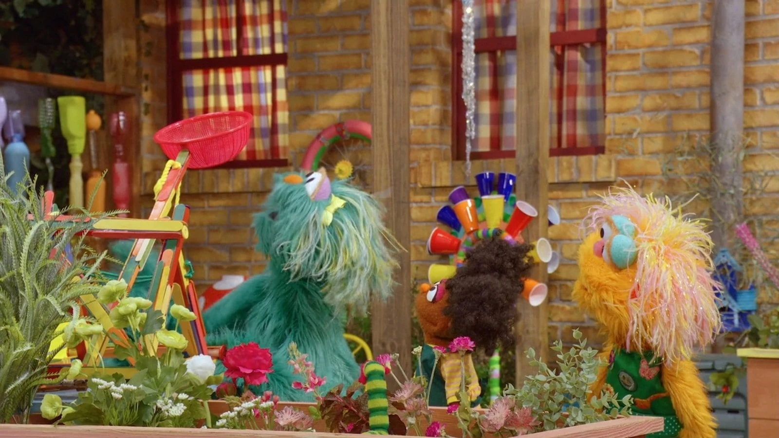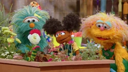 SCENE 1 | In the community garden, Gabrielle, Zoe, and Rosita hear a sad sound. It's Frankie, who wishes she could fly like a butterfly so she could play with her cousins who moved "far, far away." It is then revealed that "far, far away" refers to another planter in the same garden. Rosita points out that even though it seems really close to the three, it's really far for a little worm to squirm. Frankie explains how much of a journey it is for her, having to squirm all the way down her planter, over a watering can, across some rocks, around a hose, past a bucket of tools, and then up a rake and her cousins' planter. This is a problem, a problem for engineers. |