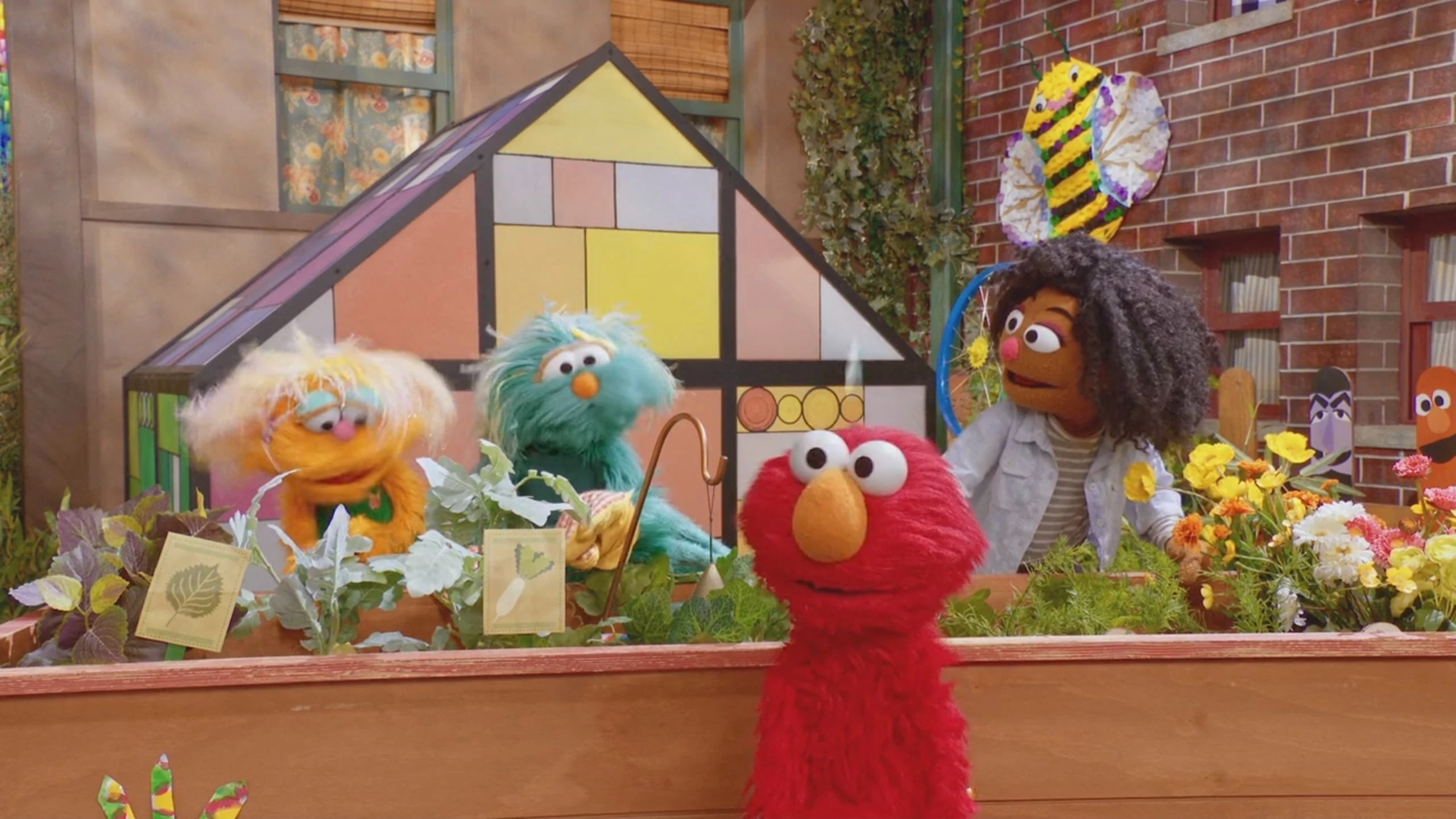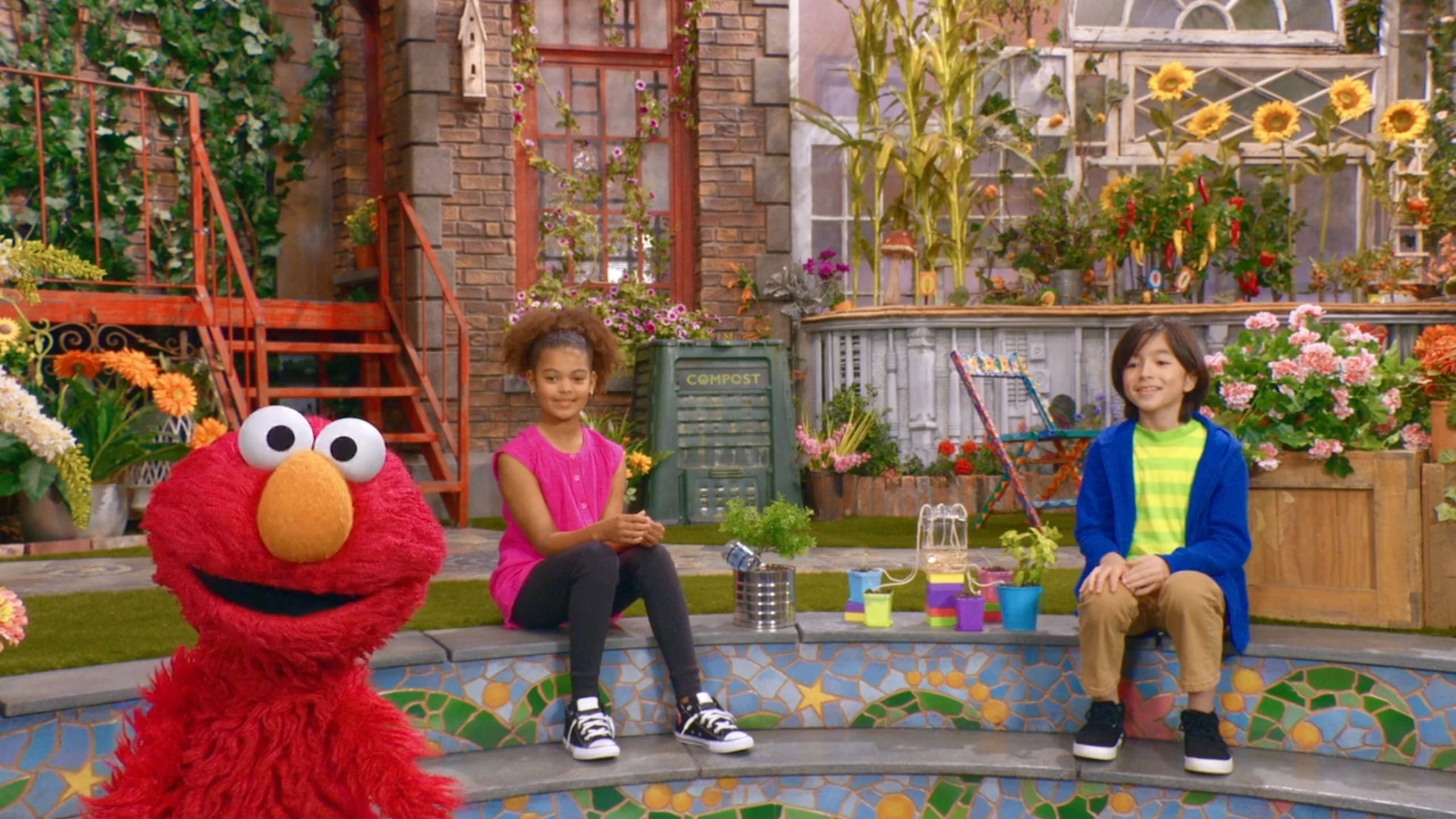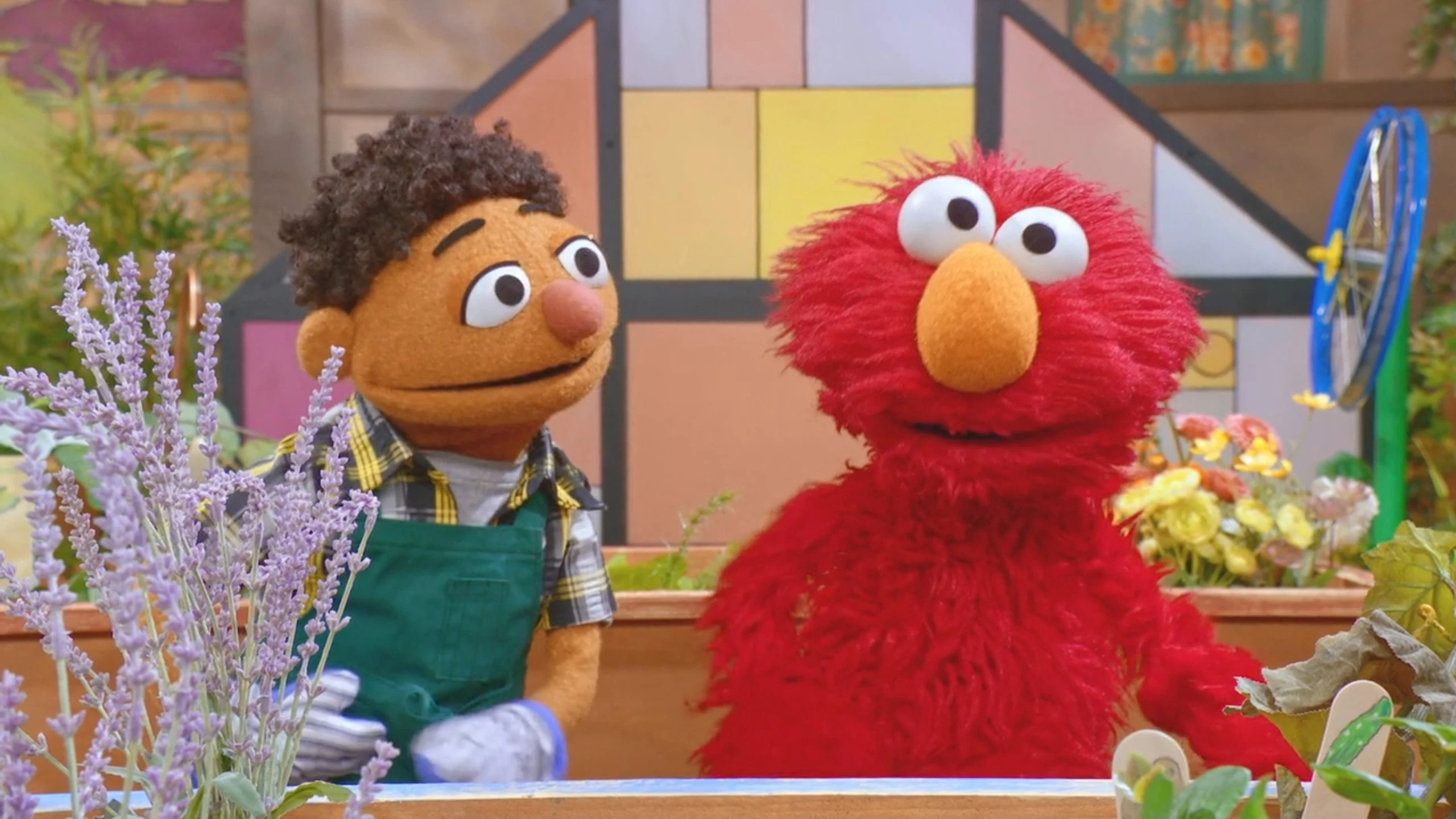 SCENE 1 | Elmo looks around the community garden to find what everyone's growing. He finds Norbert and Alfred growing beautiful flowers to give everyone on Sesame Street. |