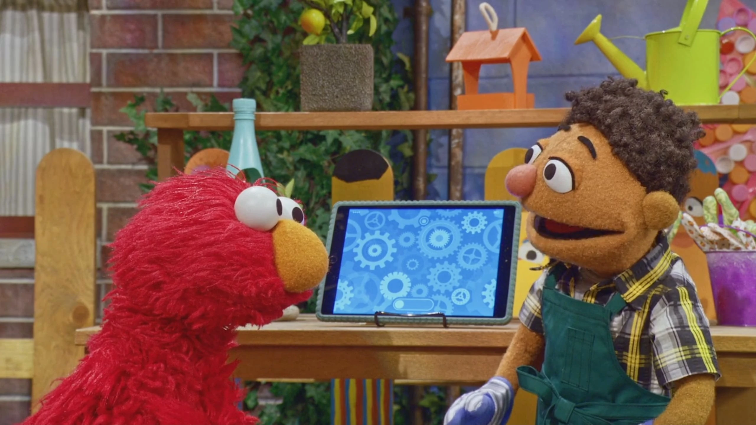 SCENE 1 cont'd | He is then distracted by Gonger yelling at Cookie Monster not to eat the signs. Elmo decides to leave the two to it and check on Kayla, Rosita, and Zoe, who are helping with Alan's vegetable garden. There, he feels a drop of water on his head and finds Slimey in a helicopter pouring water from above. Elmo asks Tamir about it, and he explains that he needs a way to keep the garden watered when he's away at robotics camp. His helicopter invention turned out to be too inefficient, even if Slimey continues to show his water-dropping skills on Elmo's head. |