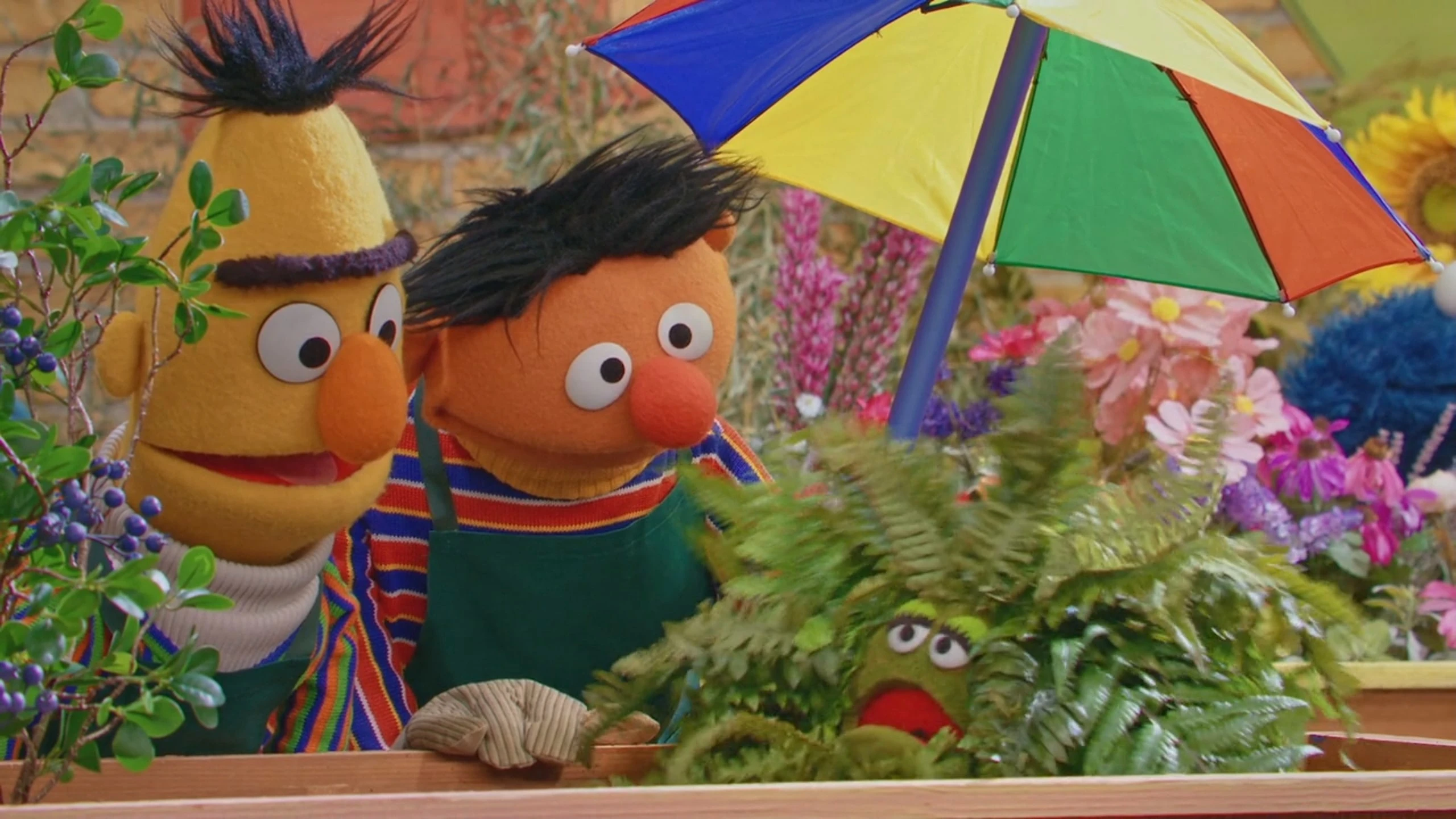 SCENE 1 cont'd | He then finds Bert and Ernie growing different things. Bert's growing blueberries, because pigeons like berries, and Bert loves pigeons. Ernie's growing a fern, which needs shade to grow, which is why he's holding an umbrella over it. Ernie asks the fern about its conditions, which Bert thinks is silly until the fern responds. |