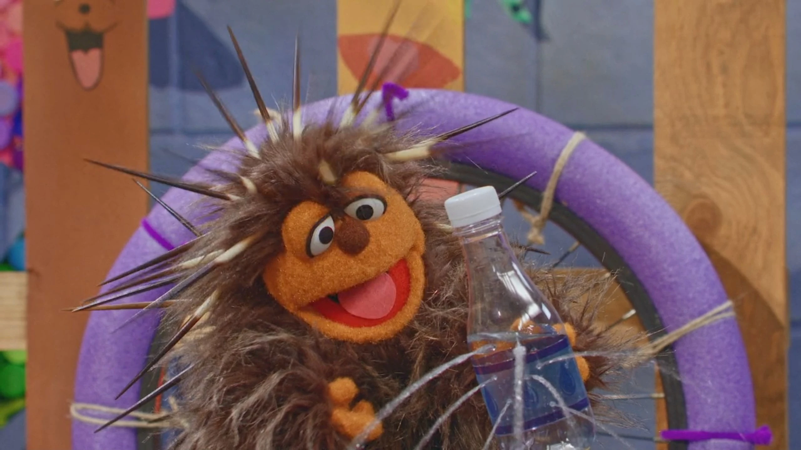 SCENE 1 cont'd | The problem remains unsolved, until the porcupine almost sits on the garden hose. This gives Tamir another idea: if the porcupine sits on an old hose and creates lots of holes, it can create a drip irrigation system. It works! The problem has been solved, but that doesn't stop Slimey from dropping one last drop of water on Elmo's head. |