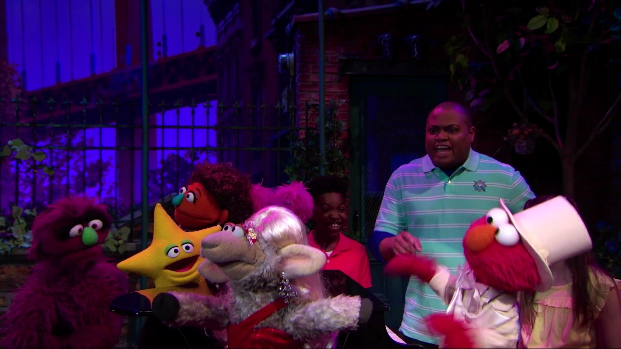 SCENE 1 cont'd | Abby poofs in and becomes starstruck at the sight of Twinkle Twinkle. She has just so happened to learn a special trick for piano playing and tests it on Elmo. Her magic gives him a snazzy white suit and superb piano skills. His playing attracts Chris and a small crowd of admirers, as well as lamb singing sensation Lady Baba, who sings along. He hits a sour note when his skills and suit suddenly vanish, making everyone disperse. Abby admits her magic must have worn off and poofs out to practice the spell. |