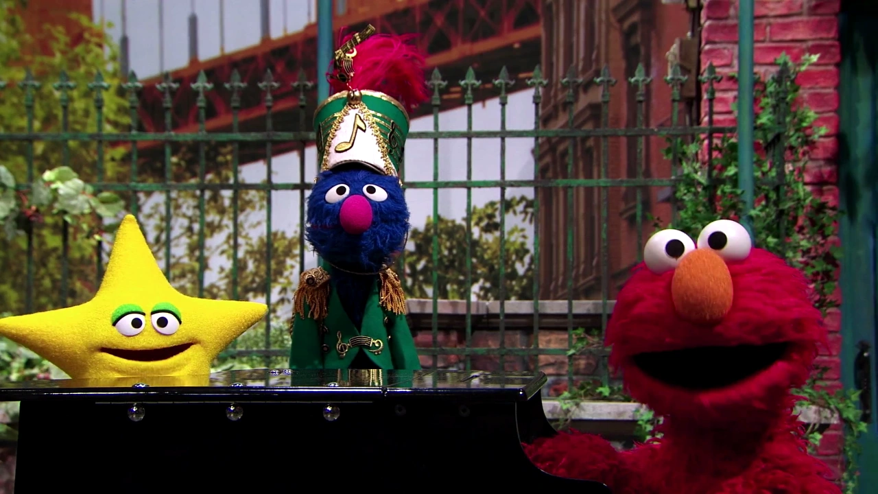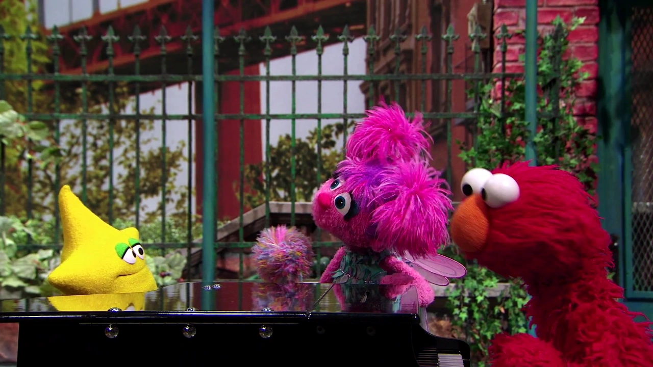 SCENE 1 | Elmo tries playing his favorite song, "Twinkle Twinkle Little Star," on the piano, but messes up a note. Telly happens by with his tuba and they attempt a duet, but both hit the same sour note; Telly vows to practice some more. Elmo struggles some more and decides to give up, when a star falls from the sky. He introduces himself as Twinkle Twinkle, the titular star from the song. He informs Elmo that whenever somebody gives up on playing his song, he loses his twinkle and falls from above. He and Elmo sing his song, encouraging Elmo to try again, but he still messes up the same note. |