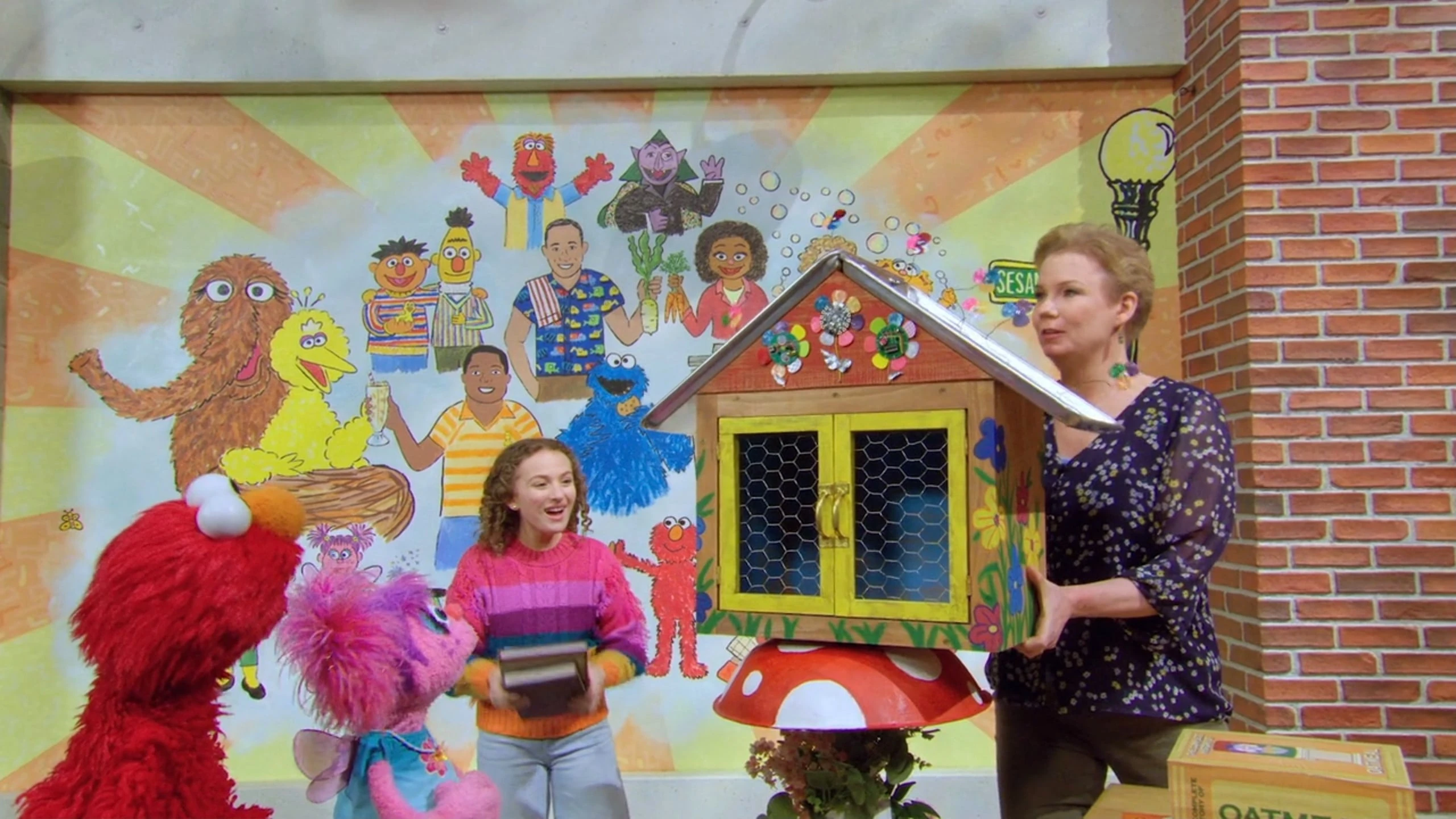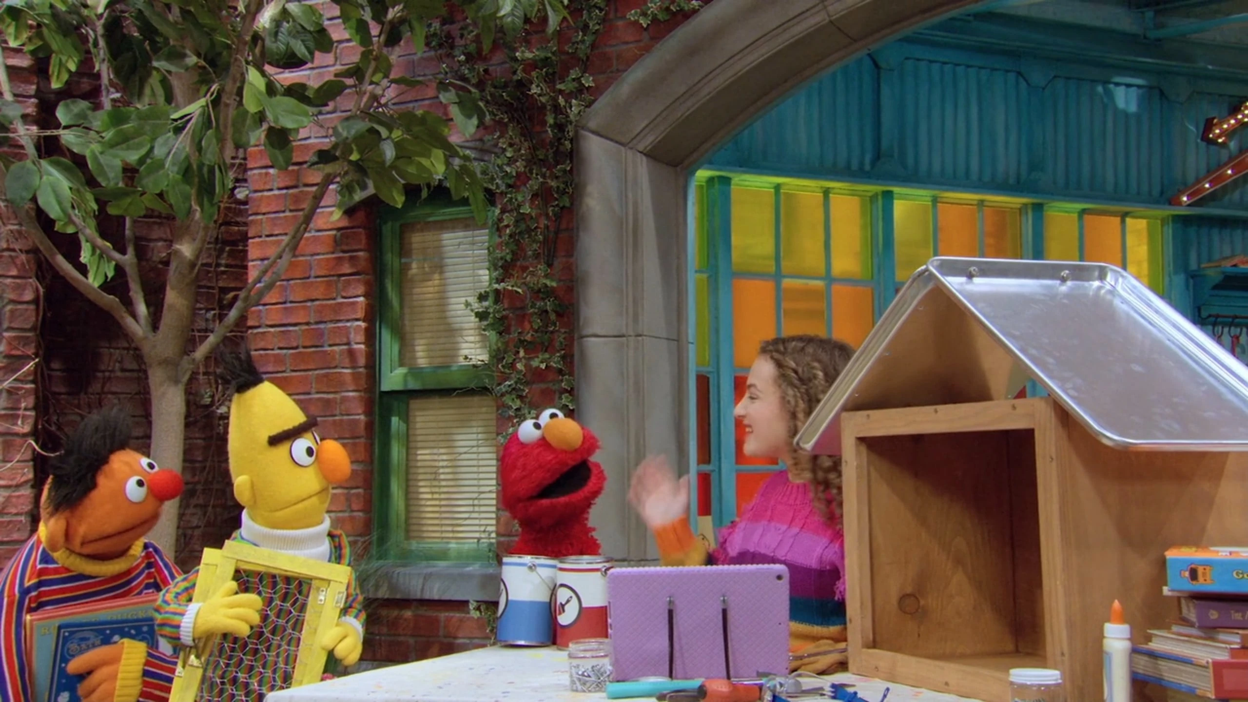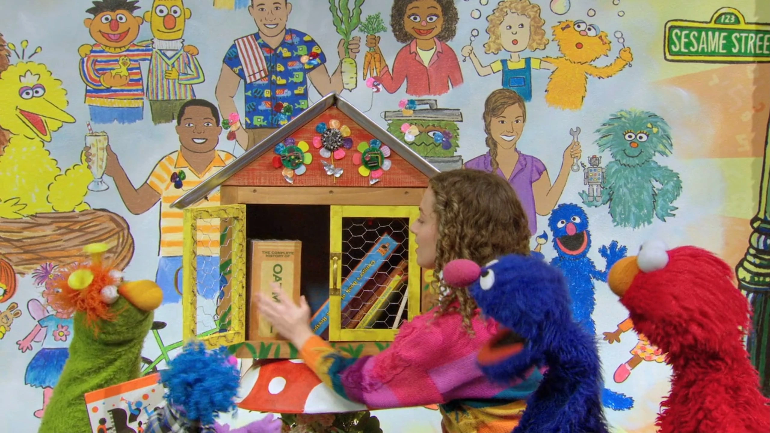 SCENE 1 | Elmo notices that his neighbors are being especially helpful today, and Charlie explains that it's because today is Mitzvah Day at their synagogue. Charlie explains a synagogue to be a temple where Jewish families like hers pray, learn, and celebrate Jewish holidays. Meredith is packing lunches for everyone and explains that a mitzvah is an act of kindness, and Charlie explains that Mitzvah Day is a day for everyone in the synagogue to help each other out on Sesame Street. When Meredith leaves, Charlie shows Elmo her Mitzvah Day project: a little library, to help the neighborhood share books as a way to make the world a kinder place. Charlie explains that she ordered a kit to build one, but it has yet to come in the mail. |