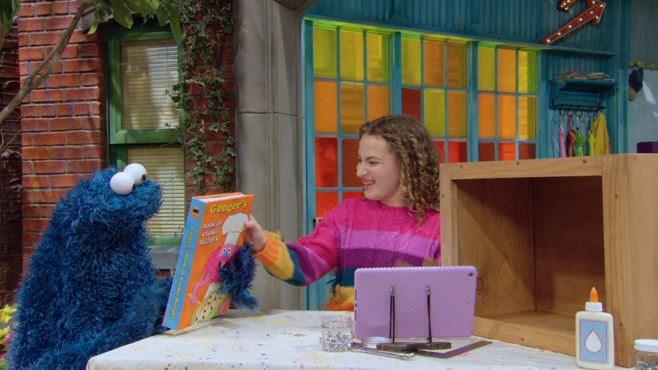 SCENE 1 cont'd | Cookie Monster walks in on the work-in-progress library with a cookie cookbook written by Gonger. He puts the book in the library, and Charlie explains that someone else could take it and put in their own book. Cookie Monster feels inspired to help, so Charlie asks if he knows of something they could use as the pointy roof. Cookie Monster pulls up two cookie trays full of cookies and suggests they be used. Charlie thinks Cookie Monster is still using them, but he quickly devours the trays' contents. |