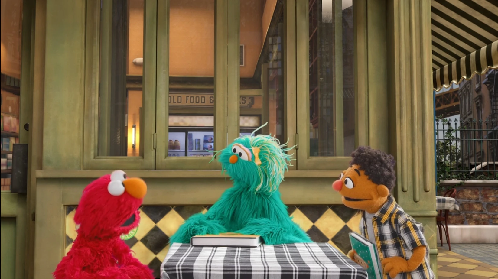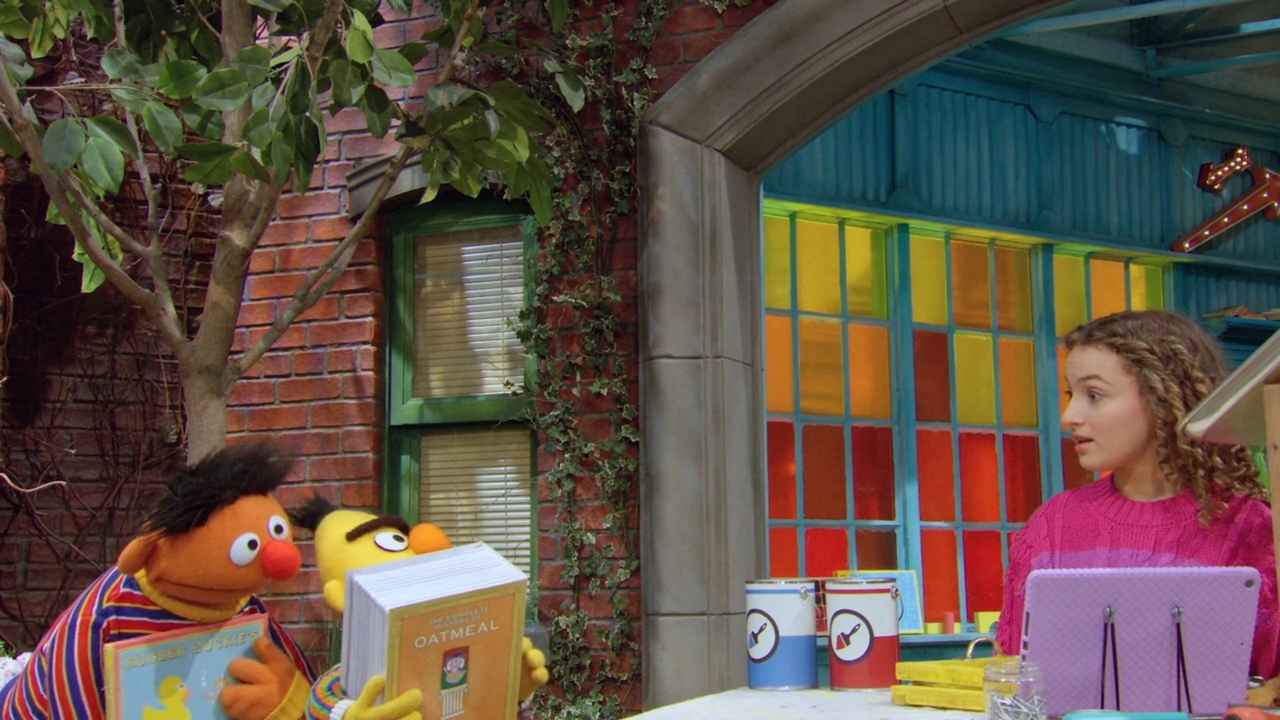 SCENE 1 cont'd | Elmo brings in some cans of paint as well as Bert and Ernie, who both offer to help Charlie with her library. Bert has doors from his very first pigeon coop. Ernie asks Charlie how she came up with the idea, and she explains that her Hebrew school teacher was telling the class ways to think of ideas. The teacher told them to think of things they wish were true about their community and find a way to make it true. Charlie wished there were a way for people to share the things they care about with each other. Ernie shows off the books he and Bert brought: Rubber Duckie's Lucky Guppy, a traditional book of bathtime shanties, and the oh-so-heavy The Complete History of Oatmeal. |