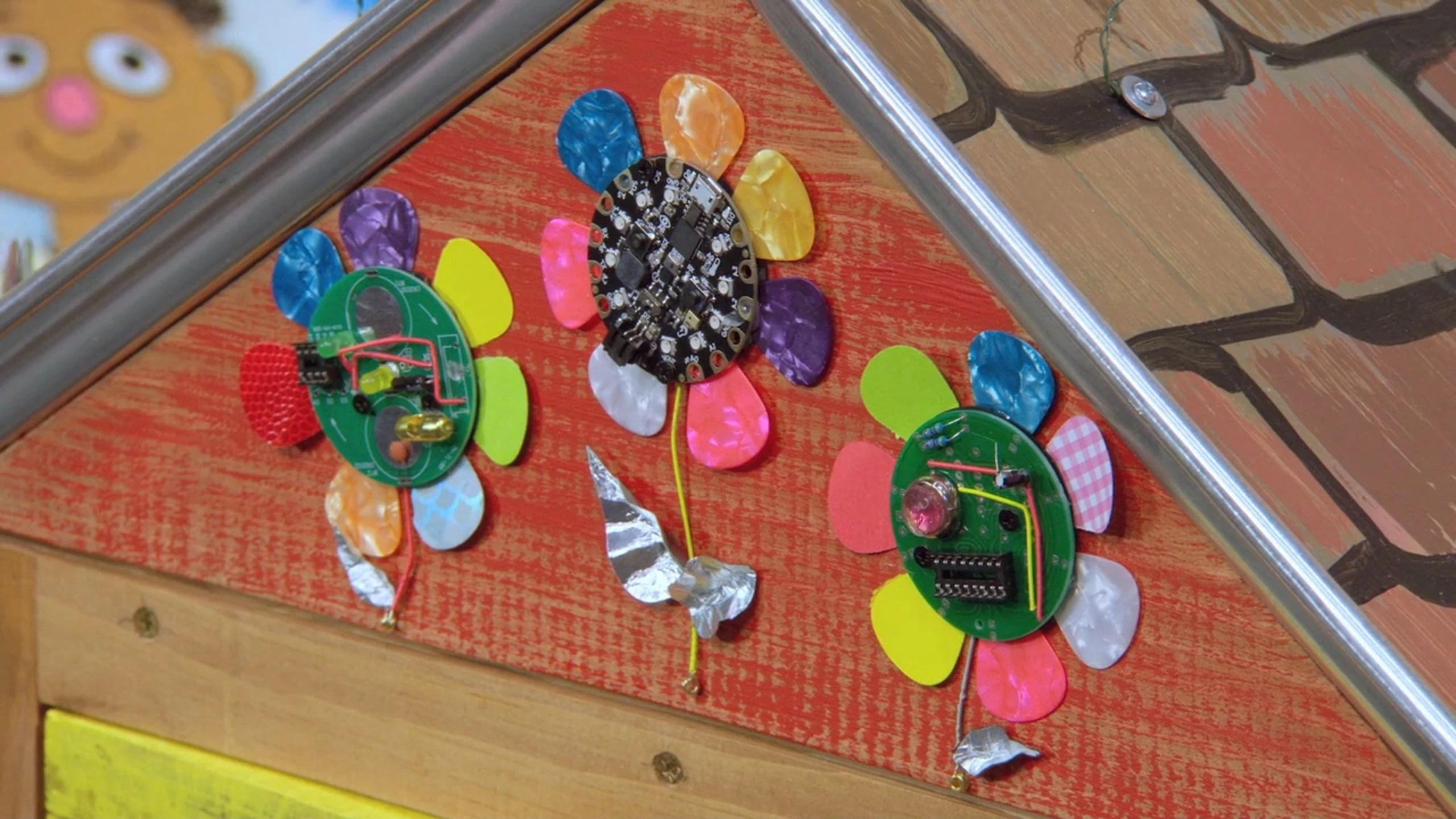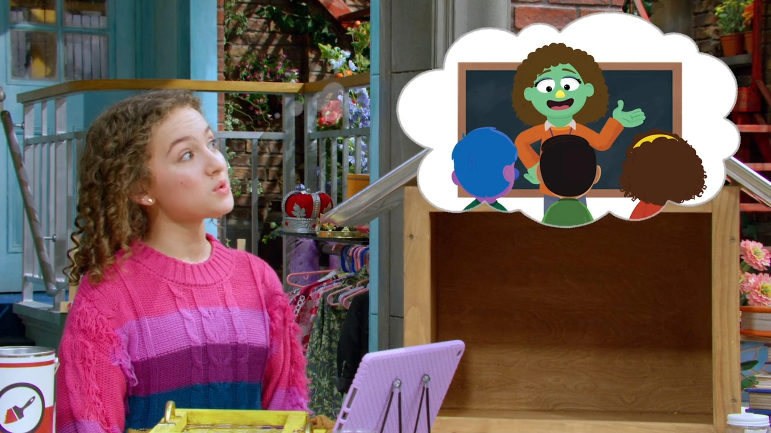 SCENE 1 cont'd | At the mural, Abby shows off her post with climbing vines which can be used to hold up the library. Meredith arrives and places the finished library atop the post, and Elmo recounts how everyone pitched in to help build it. He points out how the flowers have Rosita's guitar picks as petals, Tamir's circuit boards as the center, Ji-Young's electric guitar strings as the stem, and Oscar's tin foil as the leaves. Charlie explains that Jewish people believe in tikkun olam, which means that everyone can do a little to help make the world a better place. The whole neighborhood then joins for the grand opening and shouts, "Happy Mitzvah Day!". |