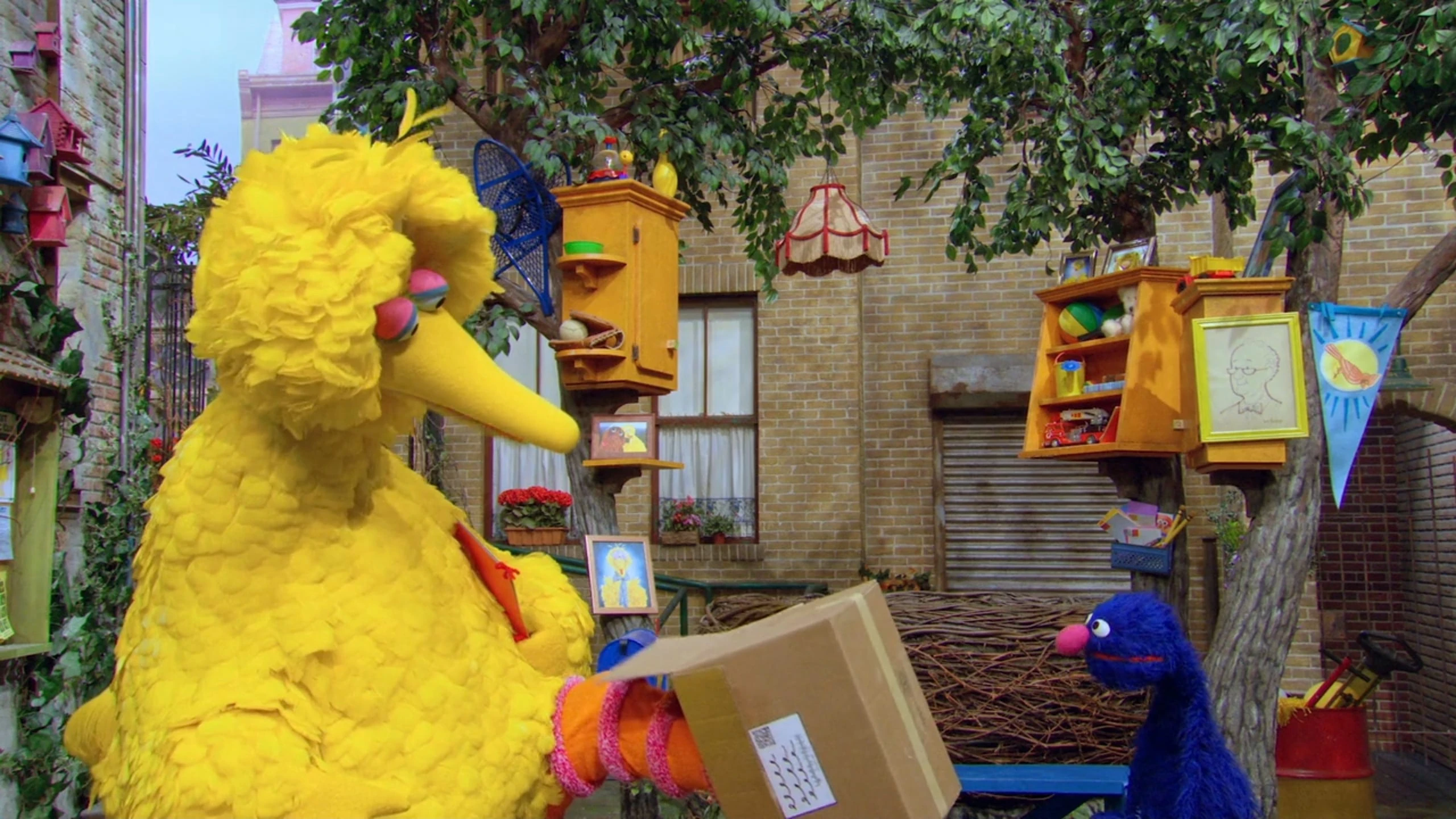 SCENE 1 cont'd | Meanwhile, Grover finds a place for the library and plants his cardboard box right next to Big Bird's nest. Big Bird wanders in and gets the box stuck to his foot. |