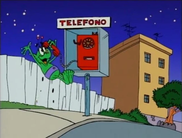 Cartoon | An alien crashes on Earth and uses a "telefono" (telephone) to get help. Artist: Oscar Gonzalez Loyo |