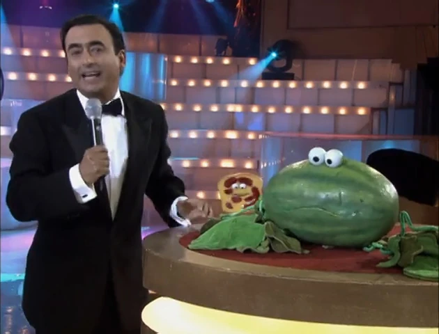 SCENE | Adal Ramones hosts "Cantando Por una Fruta", a game show for fruit who love to sing. The judges are Abelardo, Lola and Pancho. The first contender is a watermelon. After the song, a piece of toast tries to get on the show, but isn't a fruit. It covers itself with fruit jelly in an attempt. |