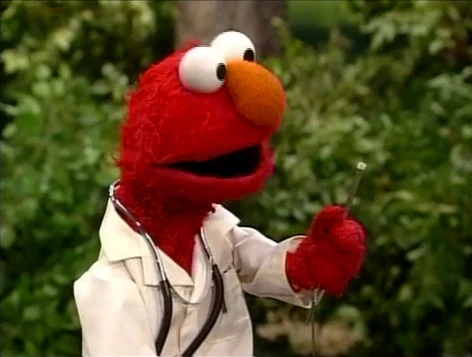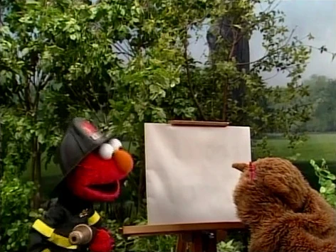 Muppets | Baby Bear comes back with another red crayon, but notices that Elmo is wearing a doctor's outfit. He's wearing them because he wants to be a doctor when he grows up, and he wants to be drawn that way now (he got the props while Baby Bear was getting the crayon). Once again, Elmo changes his mind at the last second, and runs off. He comes back dressed as a fireman, then changes his mind again and decides to be drawn as himself. Baby Bear gives up, not believing Elmo will hold still. (EKA: Episodio 731) Taken from episode 3410 of Sesame Street. |