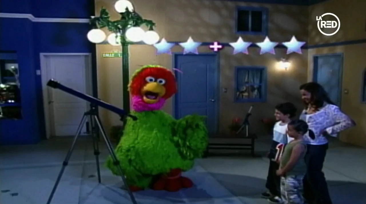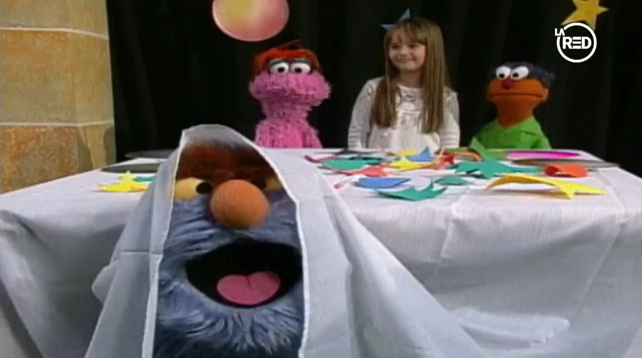 SCENE | Daniela and Lola are making a mural of outer space. Pancho appears, claiming to know a lot about space (having previously paid a visit). Suddenly, an "alien" appears behind him, frightening Pancho to beneath the table. The being takes off the mask and is revealed to be a Multimuppet boy, who wants to help out. |