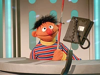2408 | The question is "What swims in the water that you can catch with a rod?" Ernie finds a rod and wants to test what he can catch with it. First he catches a telephone. During his second attempt he catches one of the studio lights, and it falls down on Bert. While Ernie tries a third time, Bert tells him that the correct answer is a fish. However, Ernie disagrees as usual since his experiment brought different results. On his third attempt Ernie catches Rubber Duckie, and since it swims in the water, that would have to be the correct answer. |