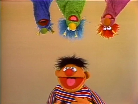 They enter the frame and Ernie takes a tally as the camera zooms in on each of them: blue with a green nose, magenta with an orange nose, and green with a yellow nose. As he announces that there are three Honkers, the trio begin honking and bouncing around as they arrange themselves in a different configuration. This happens twice, but no matter how they assemble, Ernie still counts three.