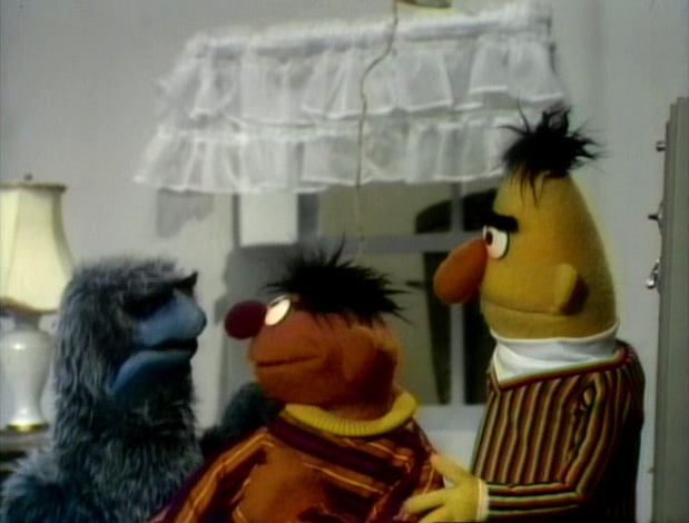 Ernie laughs when Alice Braithwaite Goodyshoes says, "Bleah!" after being kissed by a monster. Bert says that Ernie would react the same way if he was kissed by a monster. "No, I wouldn't. I'd think it was funny!" says Ernie. Then Beautiful Day Monster shows up and kisses Ernie, who says, "Bleah!" Bert laughs, saying, "Now, that's funny!"