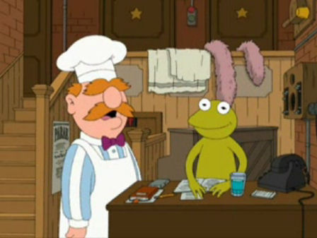 "The Tan Aquatic with Steve Zissou" At the hospital, Brian reassures Stewie that the mole on his stomach, which they believe could be connected with cancer, might turn out to be harmless until Dr. Hartman confirms otherwise, so they will have to wait for results (which will take a few days, according to Hartman). Stewie reminds Brian, "Jim Henson had a 'wait-and-see' attitude, and look what happened to him. Now we’ve got wrong-sounding Muppets!" The following vignette shows Kermit and The Swedish Chef backstage at The Muppet Theatre, both with very different voices - Kermit with a slow, monotonous voice, and the Chef speaking in English. The "American Chef" offers to make spaghetti for Kermit, to which Kermit lets out a drawn-out "Yay..." while slowly waving his arms. The two appear again at the end of the episode, commenting on Peter and Chris' reconciliation. Another "wrong-sounding" Muppet shows up and that ends up being Fozzie Bear (voiced here by Michael Clarke Duncan) who asks in a deep voice, "Wocka wocka, who wants to hear a funny-ass joke?" |
