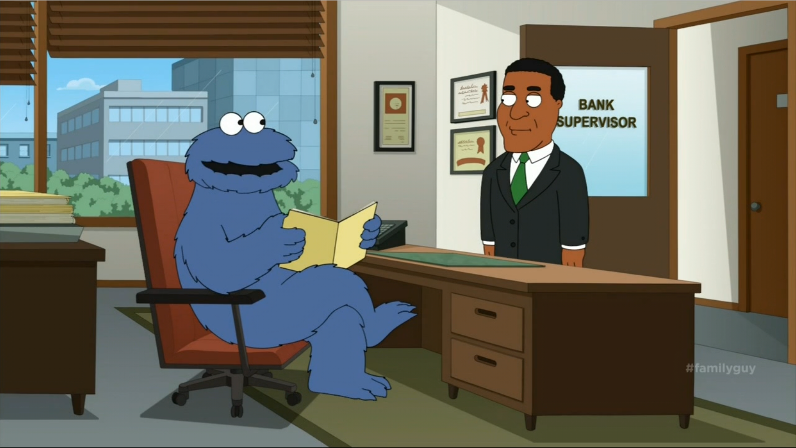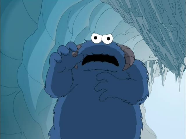 "Baking Bad" Cookie Monster is the bank manager who immediately approves of the loan for Peter and Lois' cookie store. When the shop is closed, Cookie Monster happily takes back the loan in exchange for the store. |