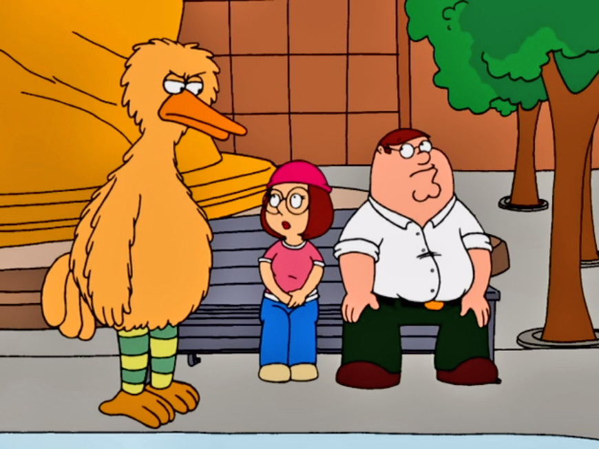 "A Picture is Worth 1,000 Bucks" At a skating rink in Central Park, Meg attracts a pigeon with her birdcalls. Peter is impressed, and asks her to do it again. She does, only this time, a pigeon doesn't respond. Instead, after a brief moment of silence, an aggravated Big Bird shows up to chew Meg out, complaining about how much of a hassle it is for him to get around town. |