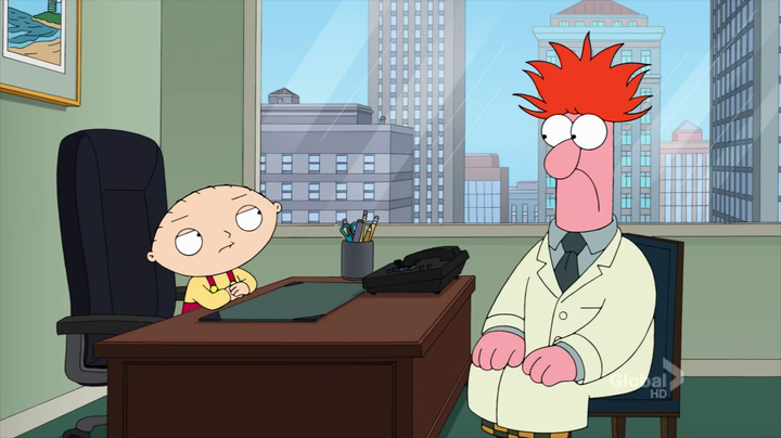 "Brian's Play" Stewie recalls being the human resource director for The Muppets, which leads to a cutaway gag of him firing Beaker due to him swiping ingredients from the Muppet lab to make meth, which is revealed he had sold to Big Bird, who appears looking beat-up, stoned and with feathers missing. |