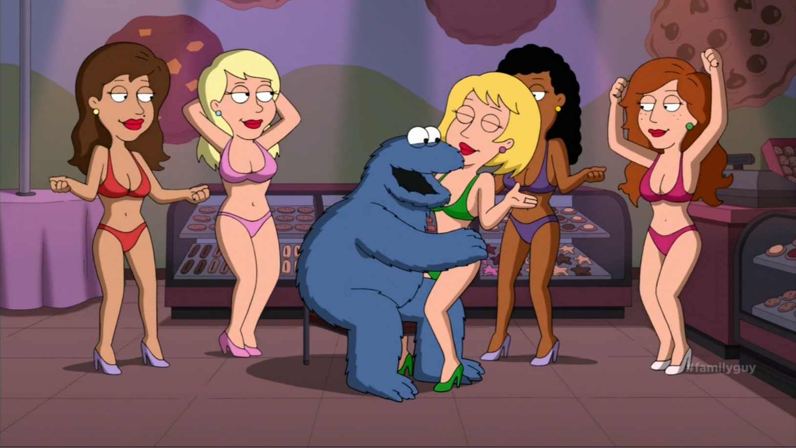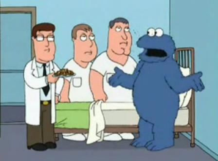 Model Misbehavior Stewie, as a CashScam executive, gets a call on his Sesame Street Phone from Grover, regarding the letter G and the number 6. Grover (whose voice is not heard) can’t seem to control himself, so Stewie has him call back later. After the conversation, Stewie asks Brian to send Lois a congratulatory basket, and to tell Cookie Monster, if he calls, that he won’t talk to him until he gets out of rehab. In a cutaway vignette, Cookie Monster is seen in a rehabilitation clinic, being treated for his cookie addiction. Doctors enter the room for inspection, during which one of them finds a plate of cookies hidden under his bedsheets. Cookie tries to deny any knowledge of this, but immediately goes on a binge, at which point the doctors tackle Cookie and inject him to sleep. Cookie appears again later on in the episode, hiding in a stall in the women's restroom, where Lois walks in on him free-basing a spoonful of cookie dough. |