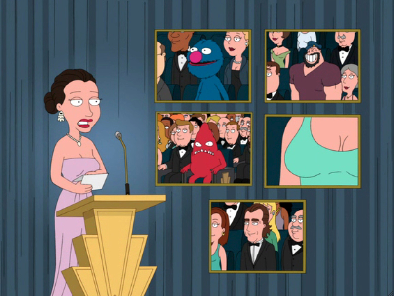"April in Quahog" Peter tells Brian that he once stuffed the ballot box for the Oscars, cutting away to a scene from the ceremony, where Grover is one of the nominees for Best Actor in a Leading Role, along with Bluto from Popeye, a red guy, a boob, and Daniel Day Lewis. All nominees lose to the red guy. |