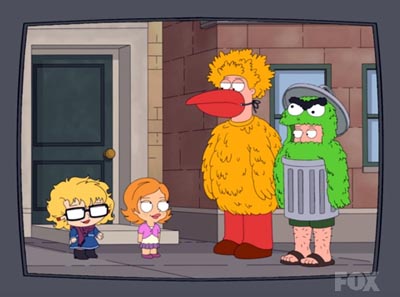 "The Peter Principal" Peter and Lois watch Sesame Street after its move to HBO, with the show featuring adult content, in which Cookie Monster "eats" at Big Bird's rear, parodying a scene from the HBO series Girls. |