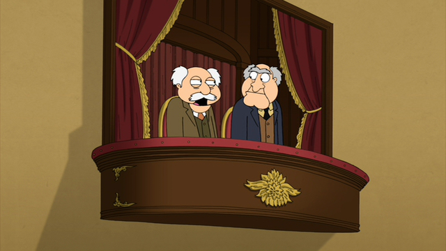 "Petergeist" When Peter decides to build a home movie theater, Lois hopes that it would be better than the living room balcony he built last time, which, as revealed in a flashback, happened to be Statler and Waldorf's box. The two curmudgeons comment on that night's episode of Lost. |