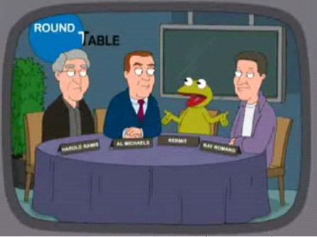 "Mother Tucker" Lois, Meg and Chris watch "Round Table," with panelists Al Michaels, Harold Ramis, Ray Romano, and Kermit, all of whom seem to get their voices mixed up with one another. |